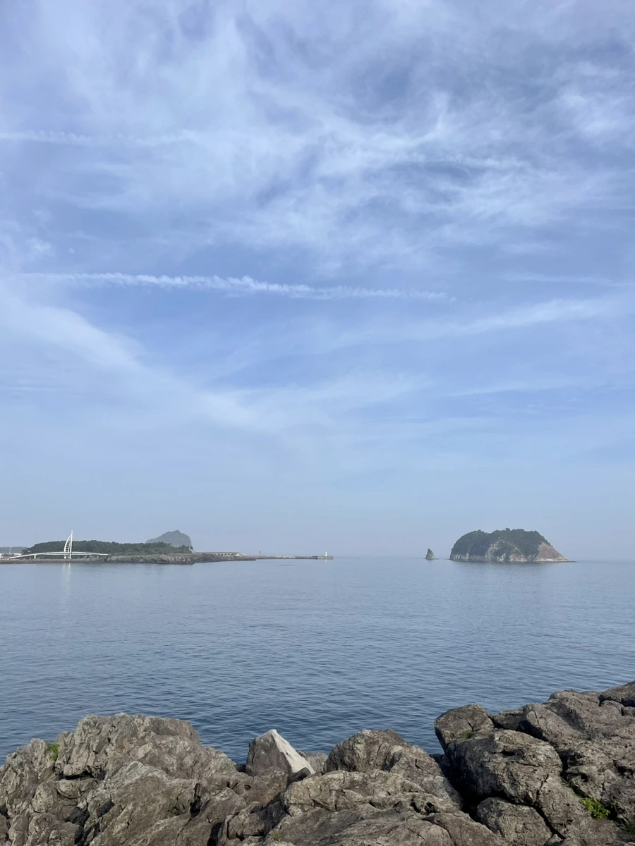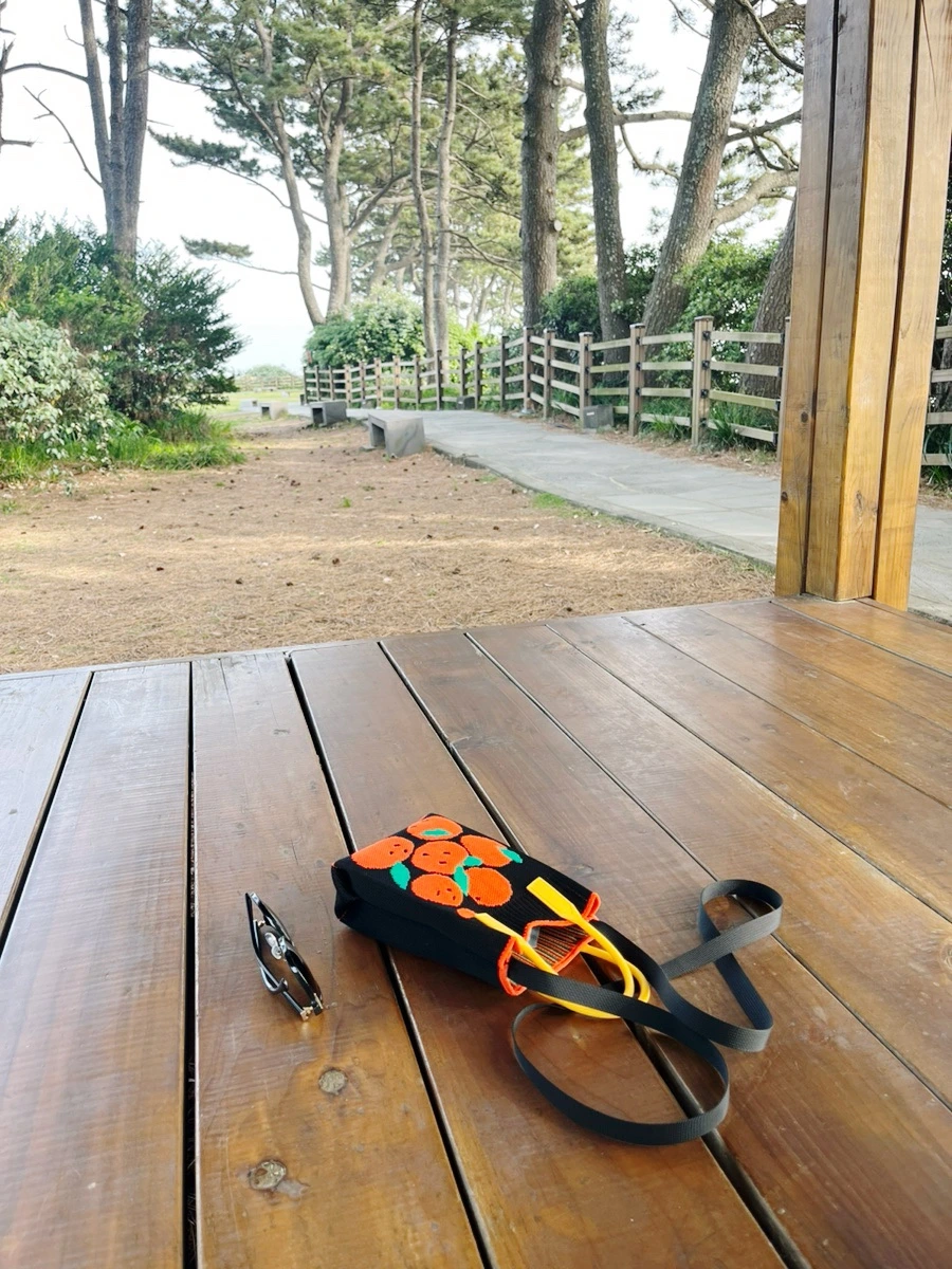 전망대 근처 정자에 앉아 잠시 쉰다. 사람이 지나가지 않는 틈 타 요가 스트레칭 해보고 호흡도 천천히 내쉰다. 정면으로는 바다가 보인다. 여유롭게 앉아 있으니 제주 와서 들은 인사들이 떠올랐다. 오늘 들른 카페 사장님은 차를 자리에 가져다 주시며 "좋은 시간 보내세요"라고 했고, 며칠 전 치유의 숲 프로그램을 마친 지도사님은 마지막에 "즐거운 여행 되세요"라고 하셨다. 별거 아닌데 혼자 여행하느라 사소한 인사들이 다정하게 느껴졌는지 모른다. 그냥 '맛있게 드세요', '안녕히 가세요' 말할 수 있는 상황에서 한 번 더 듣는 사람을 생각하고 이야기하는 듯했다.