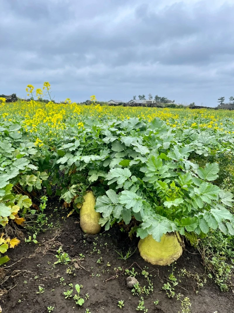 노란 꽃이 유채인 줄로 알고 걸어다니다 문득 궁금해져 검색해보았다. 대부분 배추꽃이라고 하는데, 걷다가 커다란 무밭이 함께 있는 걸 발견했다.