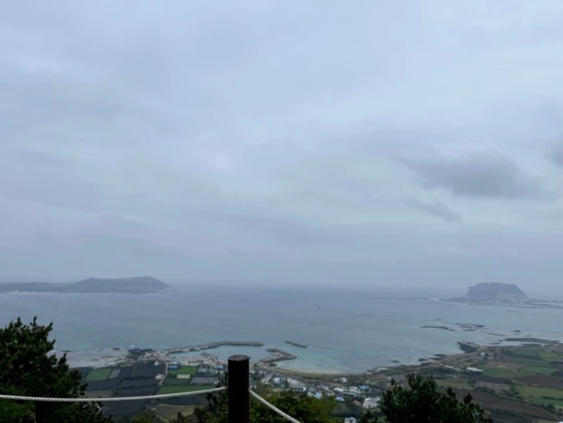 정상에 오르니 우도(왼쪽)와 성산일출봉(오른쪽)이 보였다. 정상에는 올레꾼이 여러 분 계셨다. 시원한 바람 맞으며 서로 사진 찍어주고, 몇 마디 대화를 나눴다. 올레길 전 코스를 다 걸었다는 두 분이 내가 혼자 걷고 있다 말하니 매우 걱정하셨다.