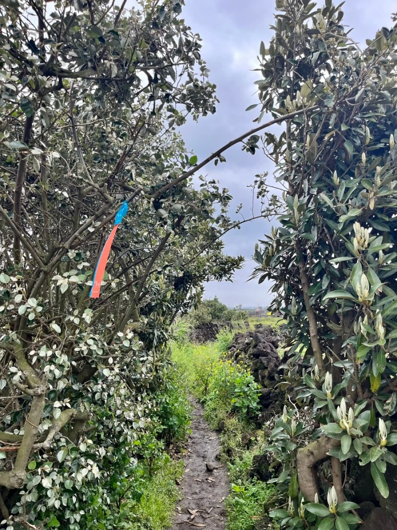 밭담과 수풀을 지난다. 나뭇가지에 달아놓은 리본들은가지가 꺾이거나 부러지면 어떻게 하지?