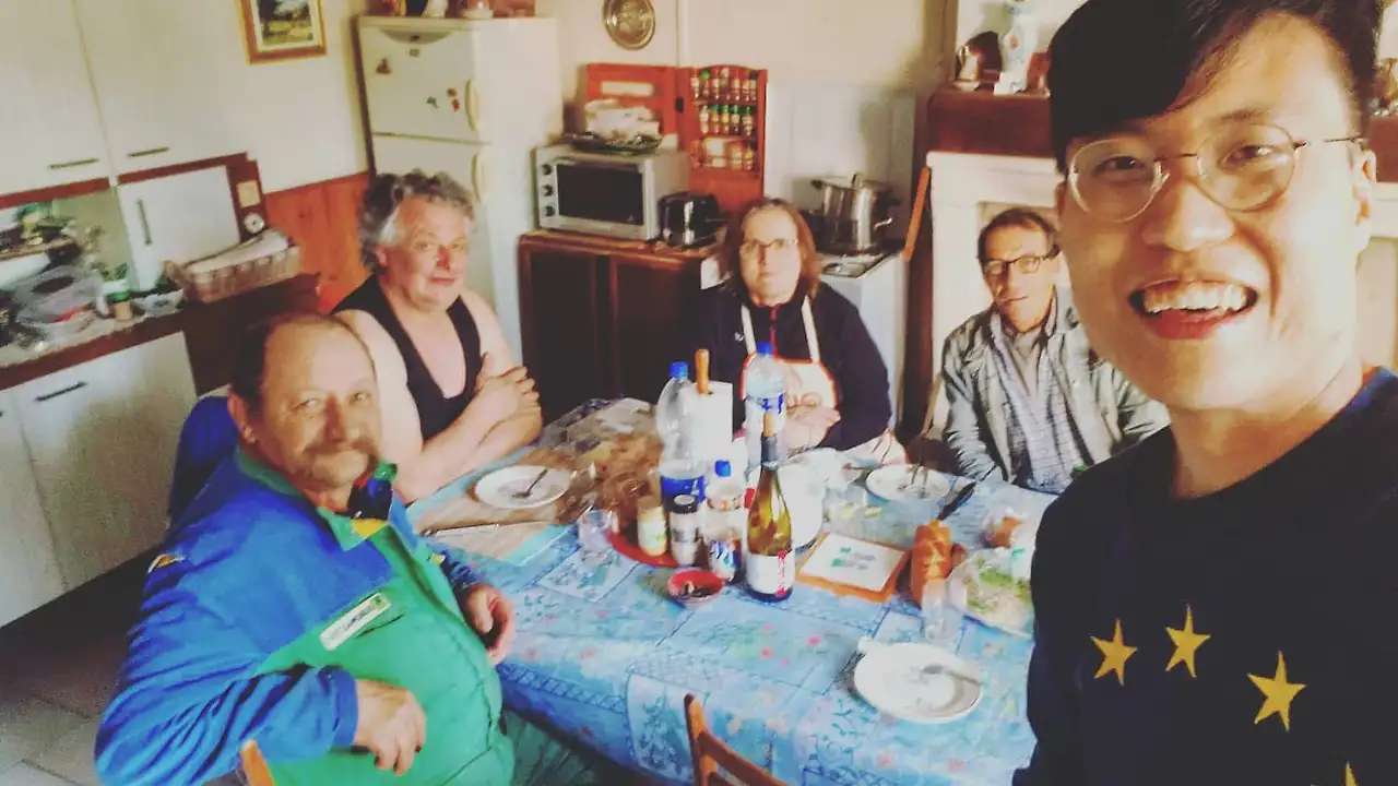 Jangmin, tu le connais? La vie est ronde est la nature est ronde. Mais dans la capitalisme, on est toujours encrassée dans les carrées. Voila. Mais tu vois? Le soleil est ronde, les raisins sont rondes, les assiettes sont rondes, nos yeux sont rondes. Le rond ne attaque pas les hommes. Mais le system profite des hommes. A la campagne, on a toujours la convivialité. On vivre ensemble. Tu le comprends? C'est la CONVIVIALITÉ.