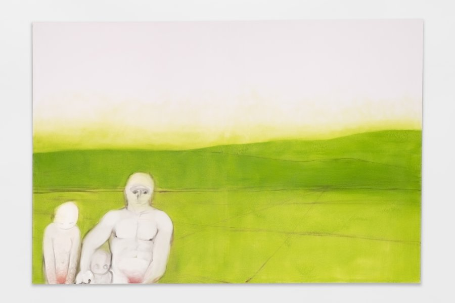 살짝 눈이 찌푸려질 정도의 밝은 연두색 들판 앞 왼쪽 가장자리에 세 사람이 서 있다.