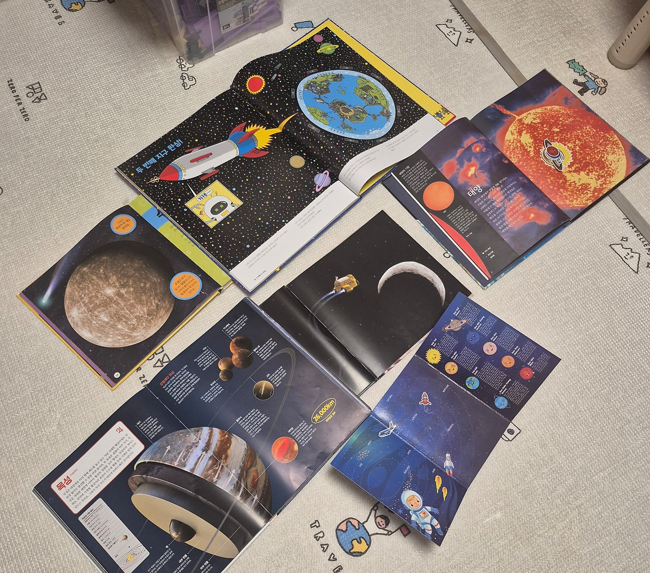 자신이 좋아하는 목성과 토성이 보이면 아이는 그 부분을 기준으로 들여다 보기 시작합니다. 저는 자연스럽게 그옆에 더 어려운 수준의 책을 열어 줍니다. 현재 우주 이외에도 숫자와 수의 개념을 위와 같은 방식으로 적용해 보고 있습니다. 아이의 눈에 자연스럽게 다음단계를 체험시켜주는 방법론을 유지합니다.
