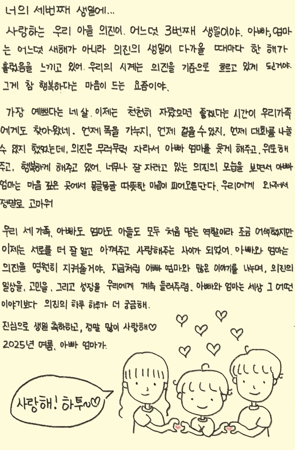 사랑하는 우리 아들 의진이. 어느덧 3번째 생일이야. 아빠, 엄마는 어느덧 새해가 아니라 의진의 생일이 다가올 때마다 한 해가 흘렀음을 느끼고 있어. 우리의 시계는 의진을 기준으로 흐르고 있게 된 거야. 그게 참 행복하다는 마음이 드는 요즘이야.