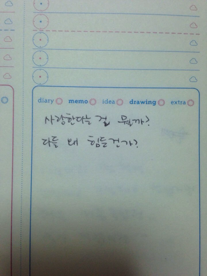 하나 둘씩 들춰 본 일기들은 정.말.로. 오그라듬 이라는 단어말고는 표현 할 방법이 없을만큼 오그라들었는데 지금 돌아보면 아무것도 아닌 그 감정들에 당시에는 왜 그렇게 심각하고 진지했는지, 난 어릴 때나 지금이나 일관성있게 진지하다는 사실을 확인했다.