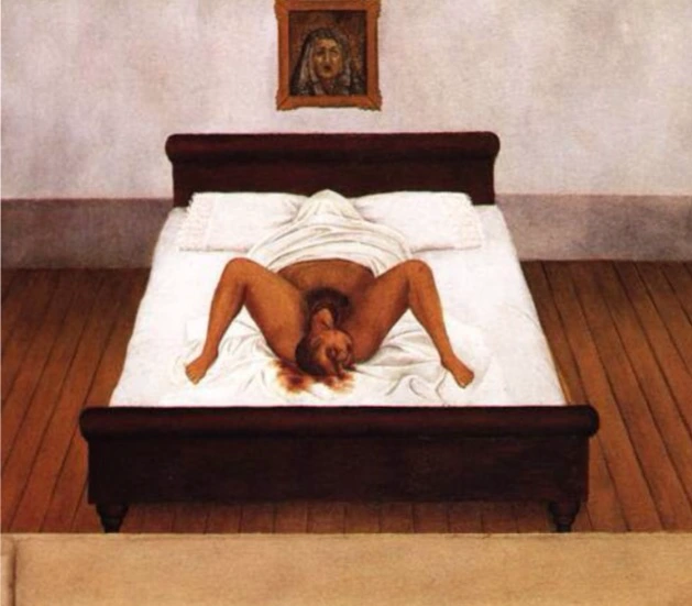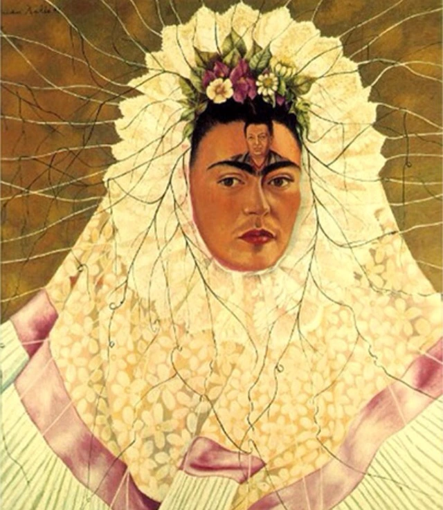 신부의 옷 입은 프리다칼로는 이마에 디에고리베라를 담고 세상에서 가장 슬픈 눈빛으로 정면을 응시한다. 올올이 풀려 화폭 전체에 펼쳐진 그물같은 레이스실 가닥가닥엔 그녀의 머리카락이 힘없이 얽겨있다.