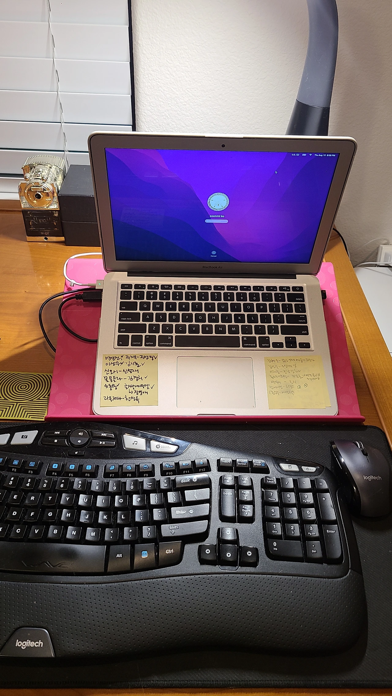 거실 한편에 있던 나만의 작은 공간이 사라지고, 식탁 끝에 어쩔 수 없이 얹어 놓은 랩탑과 필기구.