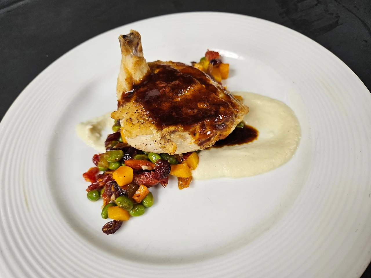 French Chicken / Pork Chop * French Chicken - Seared French Chicken/ Fennel Puree/ Edamame/ Butternut Squash/ Cranberries/ Sundried Tomatoes/ Chicken Jus