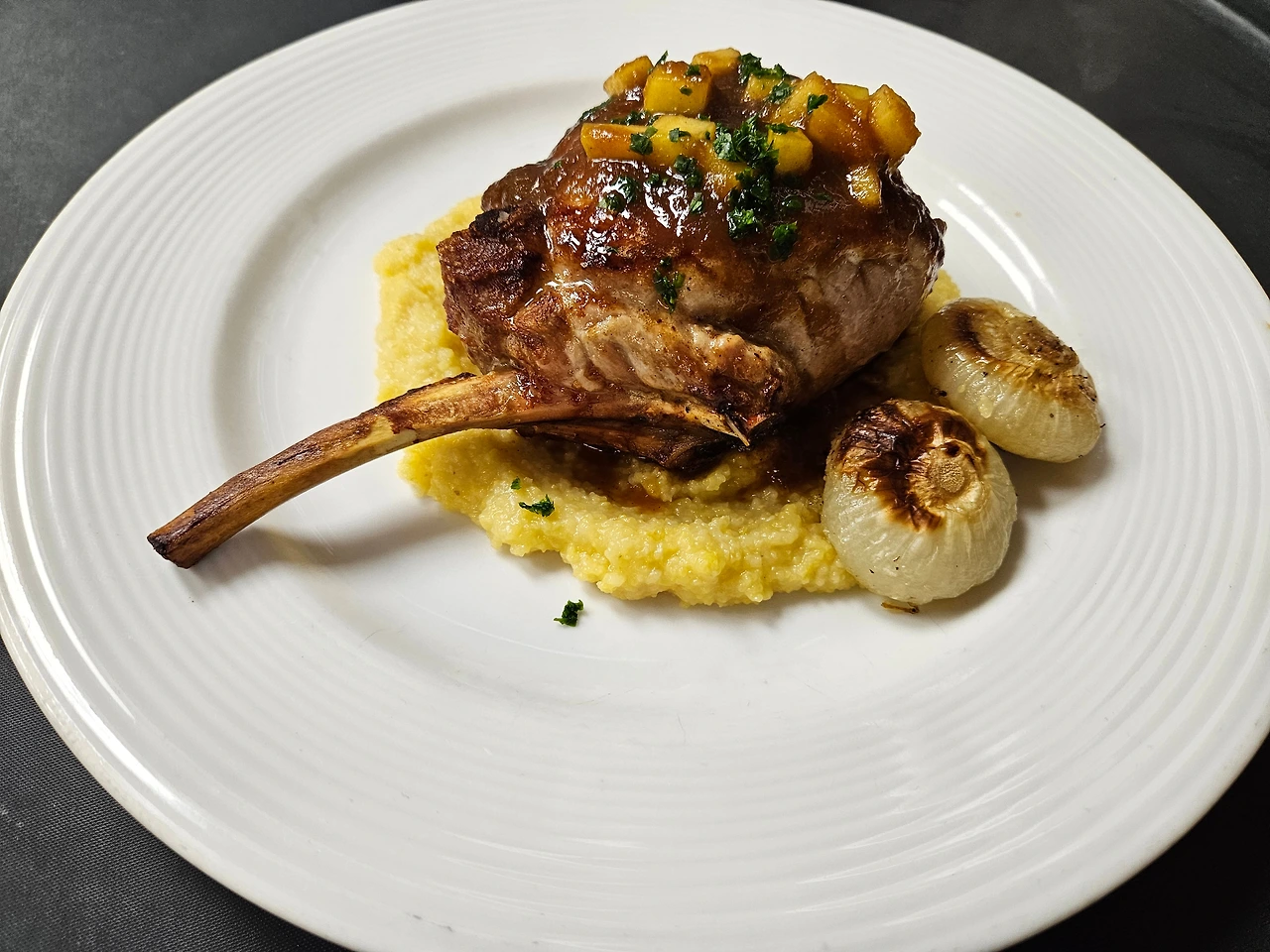 * Pork Chop - 14oz Pork Chop/ Creamy Polenta/ Diced Apples/ Apple Cider Glaze/ Roasted Cipollini onion