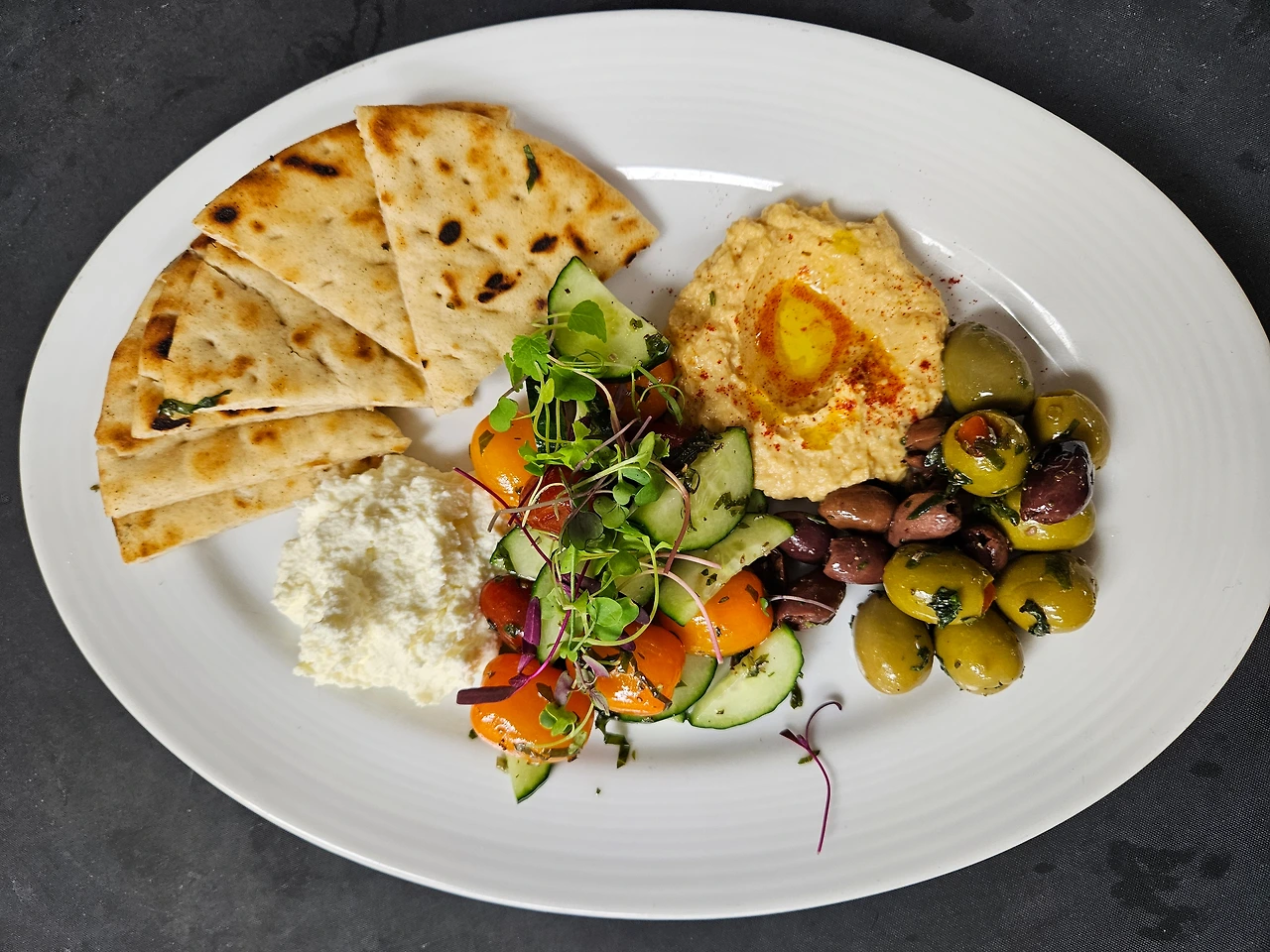 Mediterranean Platter / Baby Lamb Chops * Mediterranean Platter - Whipped Feta/ Hummus / Marinated Olives/ Tomato Cucumber salad/ Naan Bread