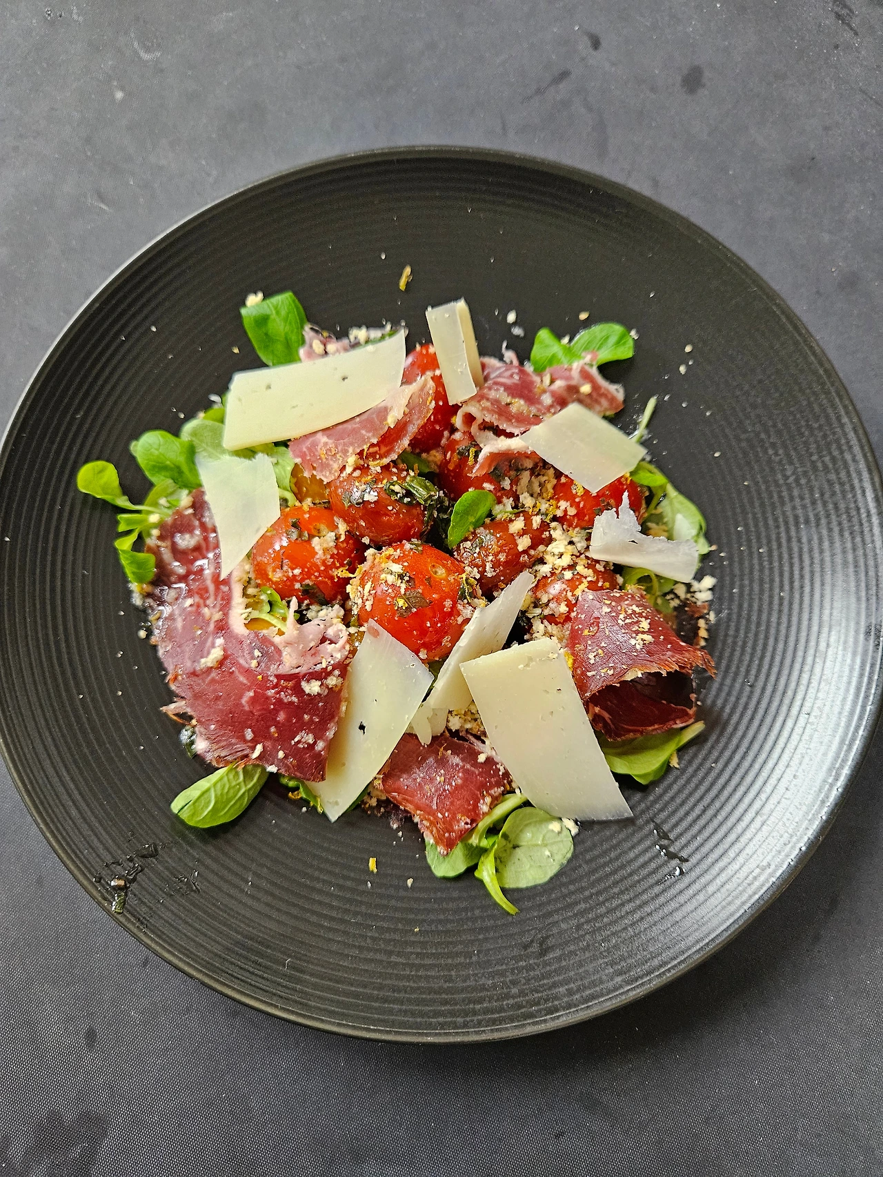 * Mache Jamon - Mache/ Iberico Ham / Citrus Almond Gremolata/ Shaved Manchego/ Marinated Tomatoes