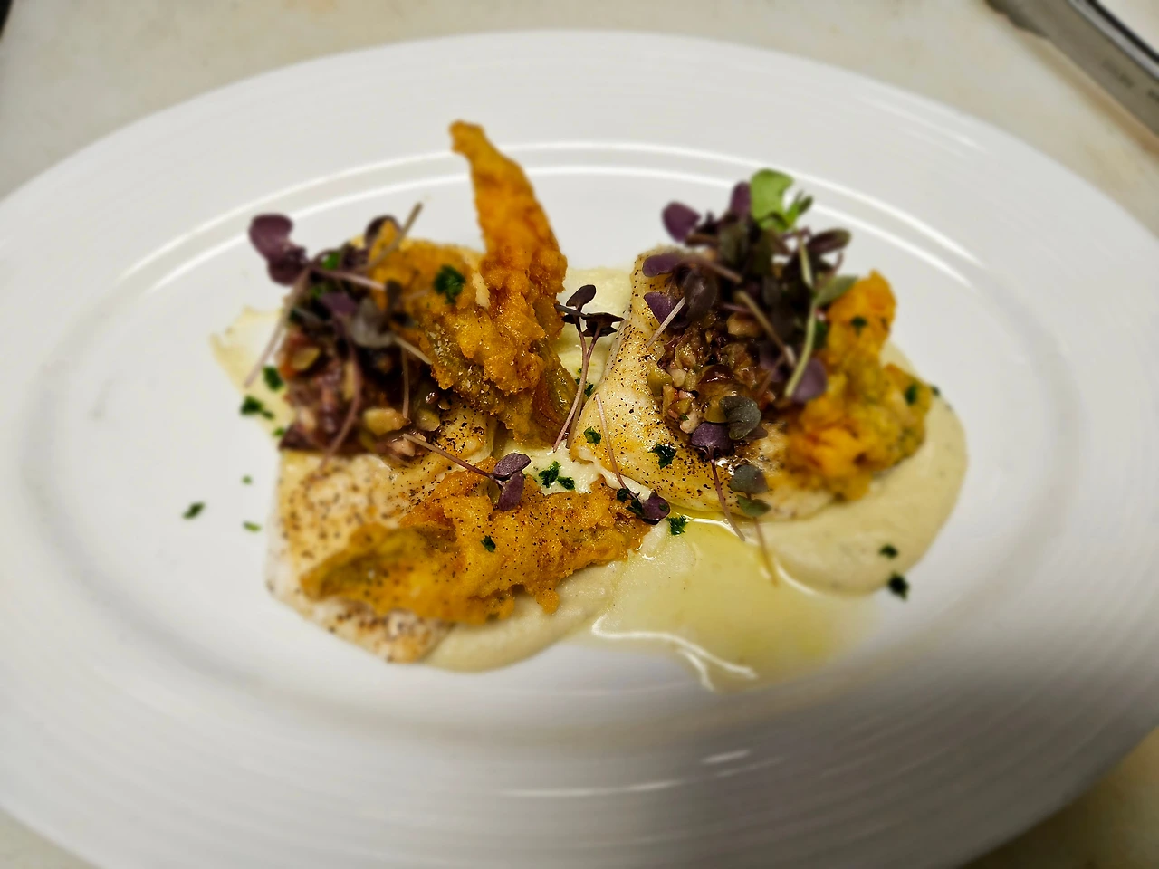 Halibut / Scottish Salmon *Halibut - Pan Seared Halibut/ Artichoke Puree/ Olive Tapenade/ Crispy Squash Blossoms/ Lemon Thyme Vinaigrette