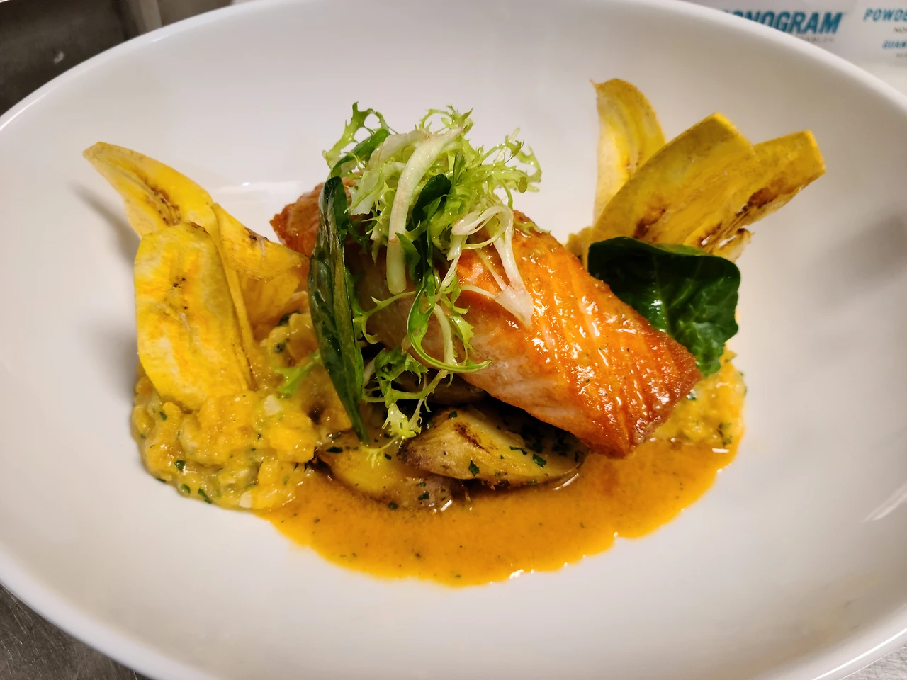 * Scottish Salmon - Pan Seared Salmon/ Crispy Plantain/ Fingerling Potatoes/ Spinach/ Corn Puree / Carrot Vinaigrette