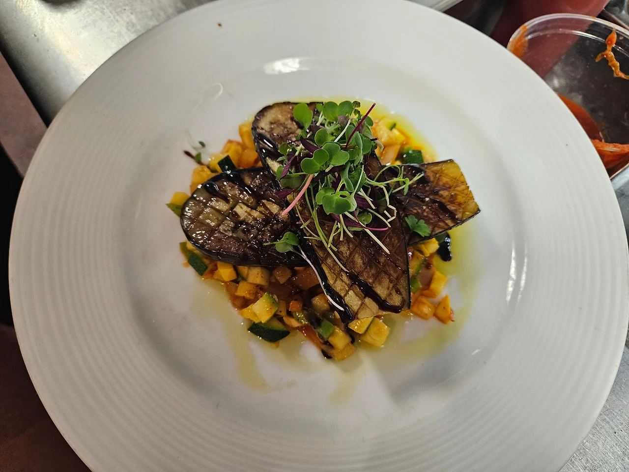 Japanese Eggplant / Mushroom Shrimp Ravioli * Japanese Eggplant - Roasted Eggplant/ Balsamic Glaze/ Ratatouille/ Basil Oil/ Micro Greens