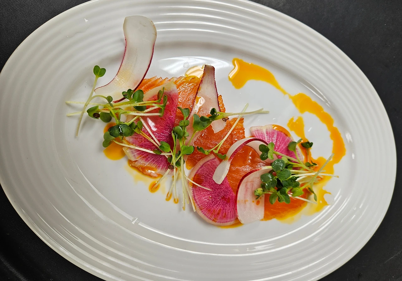Cured Salmon / Mache Jamon * Cured Salmon- Radish Medley/ Radish Sprouts/ Chili Oil