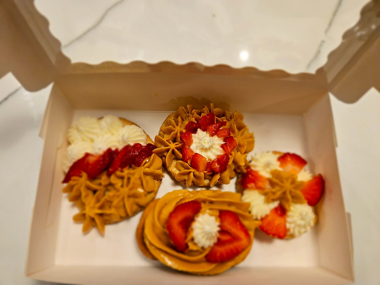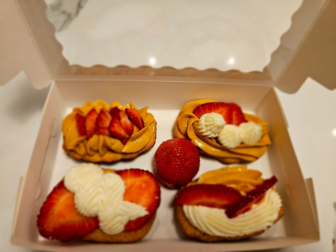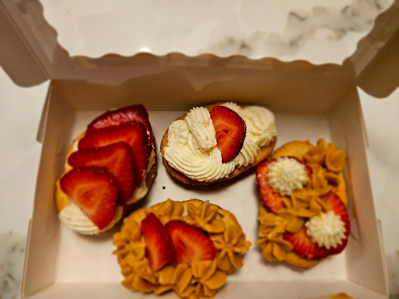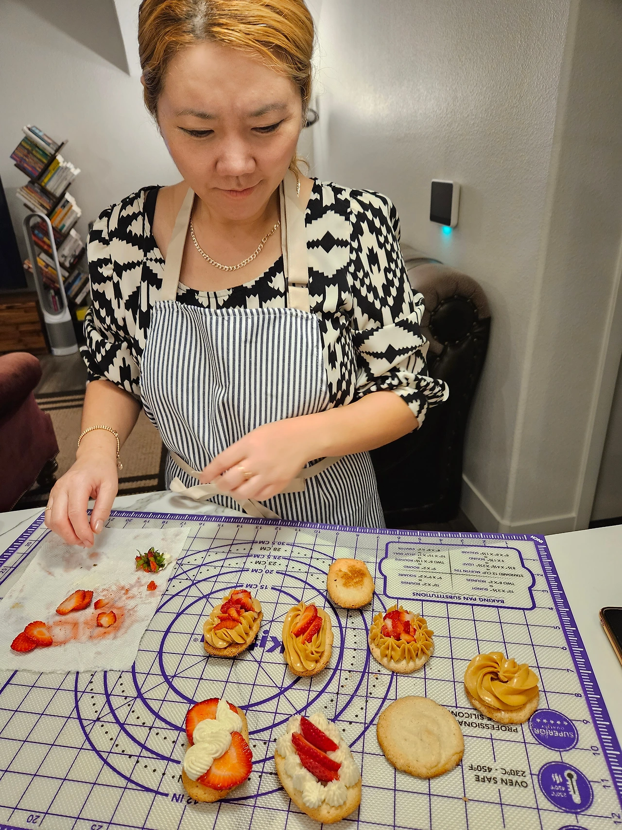 마카롱처럼 두 개를 겹쳐서 안에 필링을 넣는 게 정통적인 방법이지만, 타르트처럼 크림 올리고 장식하기로! 캐러멜버터크림과 크림치즈 크림 두 가지 만들어서 딸기와 함께 데코. 다음 주에 내가 골프클럽 데크오븐에서 구운 다쿠아즈와 비교해 보기로 했다. 갖고 싶다 데크오븐!