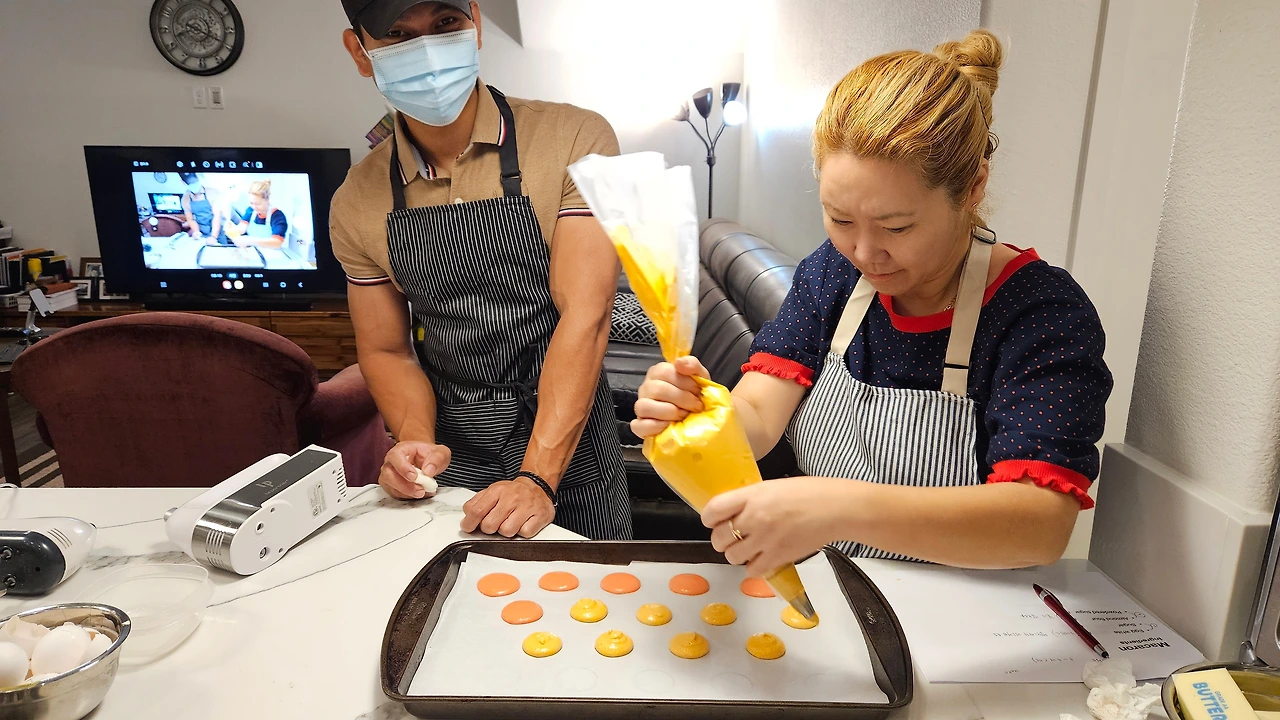 반죽을 4배로 만들고, 안에 들어갈 필링 또한 4배로 만들어 대량 생산에 성공한 우리의 다섯 학생! 필링은 크림치즈 베이스 크림 하나, 고소하며 달달한 파타봄브 두 가지로 했다. 파타봄브는 계란 노른자 베이스로 만든다. 파타봄브는 이탈리안 머랭 만들듯이 계란 노른자를 휘핑할 때 시럽을 조금씩 부어주면 된다. 여기서 가장 중요한 건 버터도 크림치즈도 모두 냉기를 빼줘야 하는 것. 손으로 누르면 부드럽게 들어갈 정도! 그래야 크림 베이스에 버터가 자연스럽게 스며들지, 그렇지 않으면 베이스와 버터가 분리되어 크림이 만들어지지 않는다.