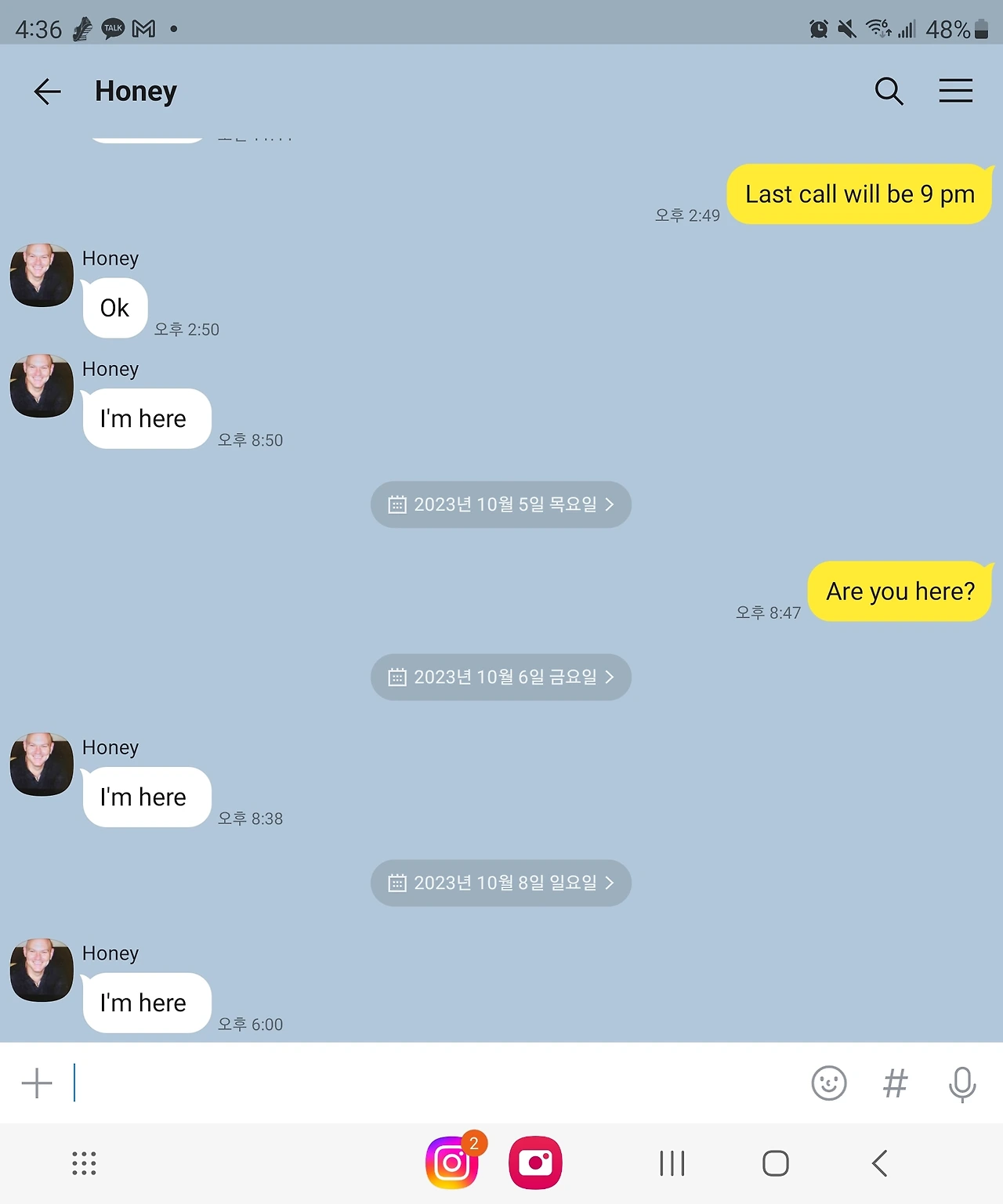 곧 결혼 20주년을 맞는 우리. 이제 공짜로 영상통화까지 가능한 시대에, 20여 년 전 "용건만 간단히"를 실천 중인 건가. 남편과 보낸 카톡을 주르륵 훑어봤다. 퇴근 후 픽업하러 온 남편이 남기는 "I"m here." 심지어 남편은 대답이 없거나, 난 며칠간 톡을 확인하지 않기도 한다.