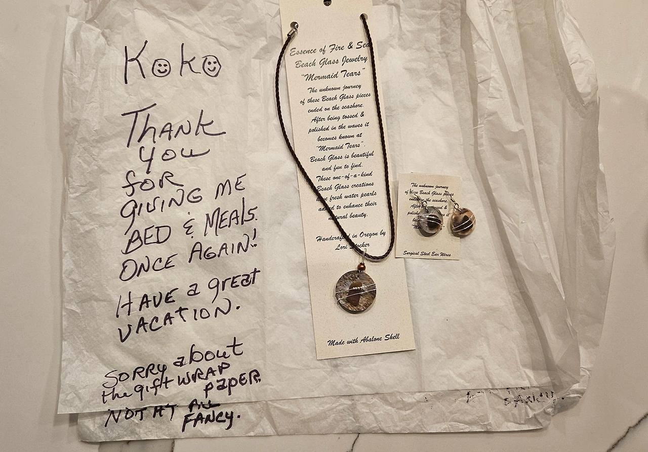 시누가 선물을 두고 간지도 몰랐다. 남편이 아일랜드 위에 선물이 있다고 알려줘서야 보게 된 시누 선물. 내 이름 안에 스마일 넣는 사랑둥이, 센스쟁이 시누. 스타일리시한 귀걸이와 목걸이는 한국 갈 때 이쁘게 하고 가야지. 한지 같은 종이에 남긴 메모라 이쁘기만 한데, 고급지지 못해 미안해하는 맘도 고운 시누. 무탈하게 잘 돌아갔기를...
