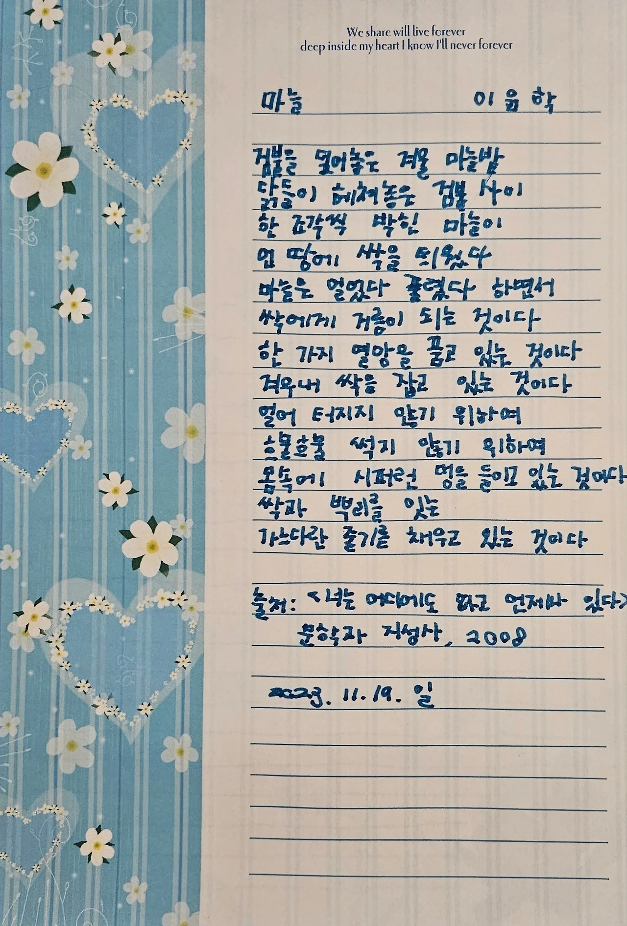 "흐물흐물 썩지 않기 위하여 몸속에 시퍼런 멍을 들이고 있는 것이다"란 표현을 오물오물 씹었다. 시퍼렇게 온몸에 박힌 멍울 덕에 살아 냈음을 알았다. 빨갛게 파랗게 무지개색으로 빛나는 멍 덕분이었다.