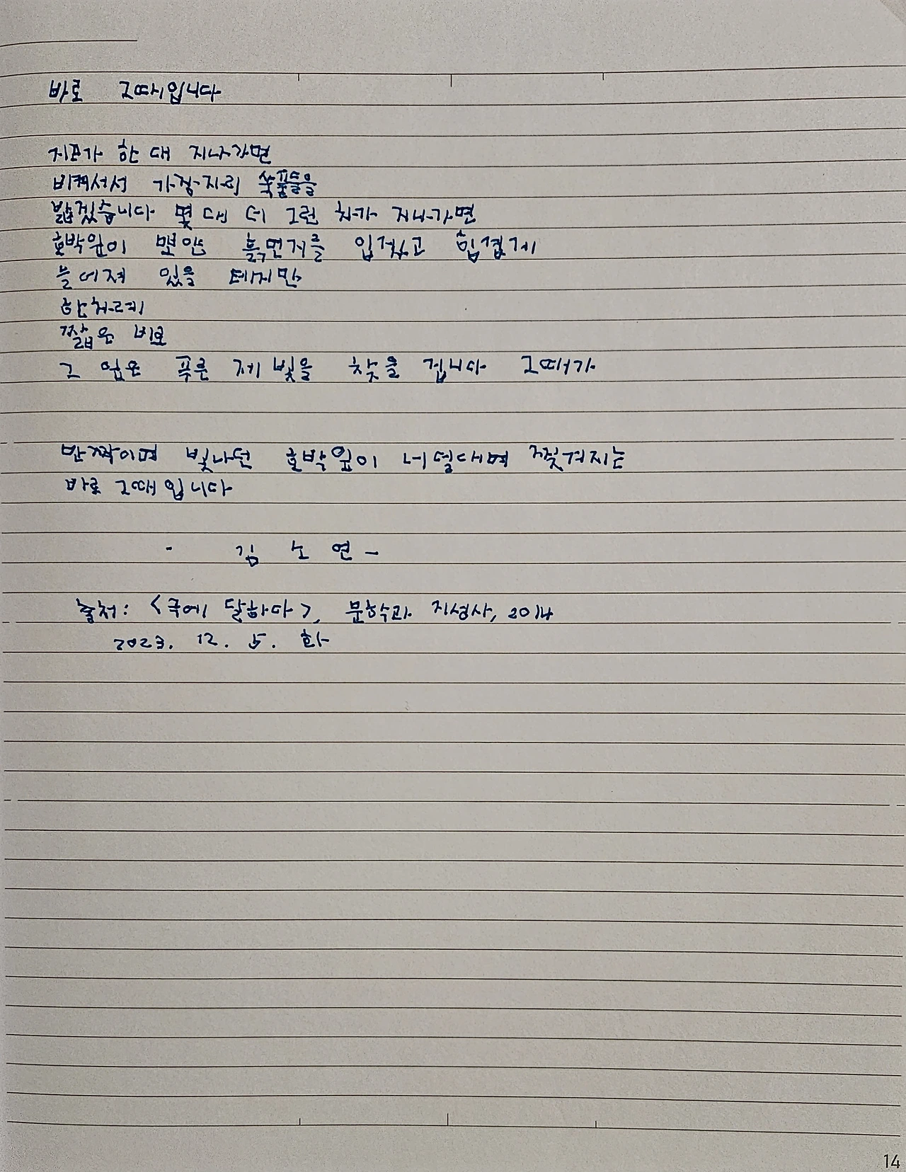 한 학기를 마무리하면서, 라강 참여율이 지난 학기보다 낮아서 아쉬웠고, 시가 더 궁금해졌고 잘 쓰고 싶어졌다. 메시지를 주려고 통제하지 않고, 내 맘에 쏙 드는 시, 나도 쓰고 싶어졌다.
