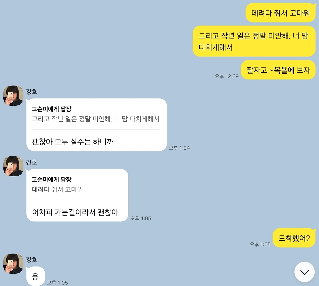눈도 못 맞추고 비겁한 변명을 늘어놓는 내게, 강호는 따뜻하게 눈 맞추며 그 쓸모없는 변명에 답을 해줬다.