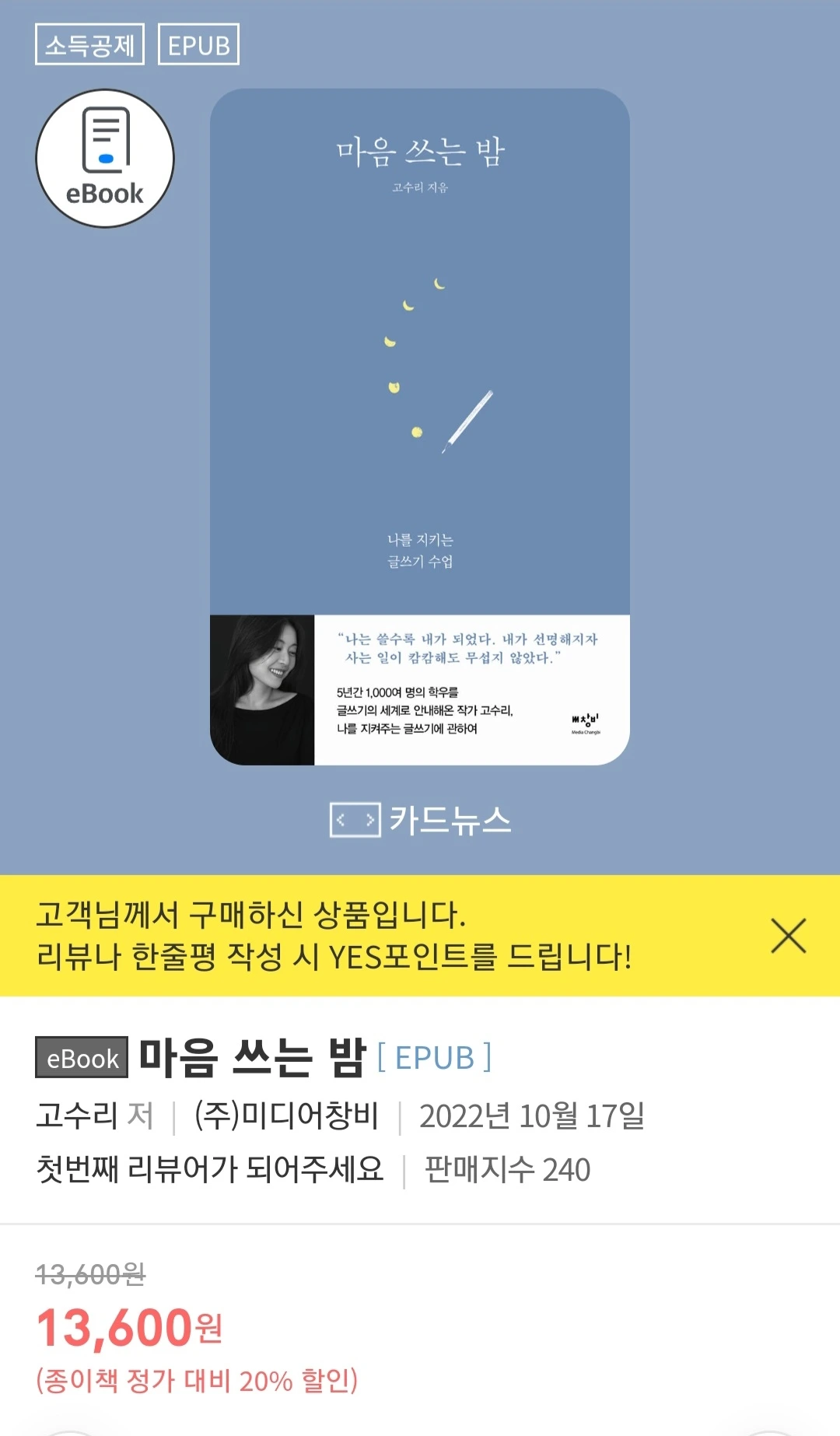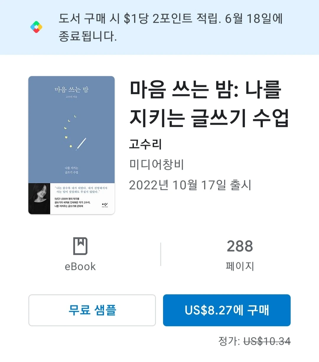 마음 쓰는 밤이 yes 24에서는 14,280원인데, 플레이 북에서는 $8.27 기준환율 1,273을 한화로 환산하면 10,528원이다. 즉 3,752원 비싸게 샀다. yes 24에서 전자책을 4~5권 더 샀으니 만원 이상 손해 봤다. 책 한 권을 더 살 수 있는 돈이다.