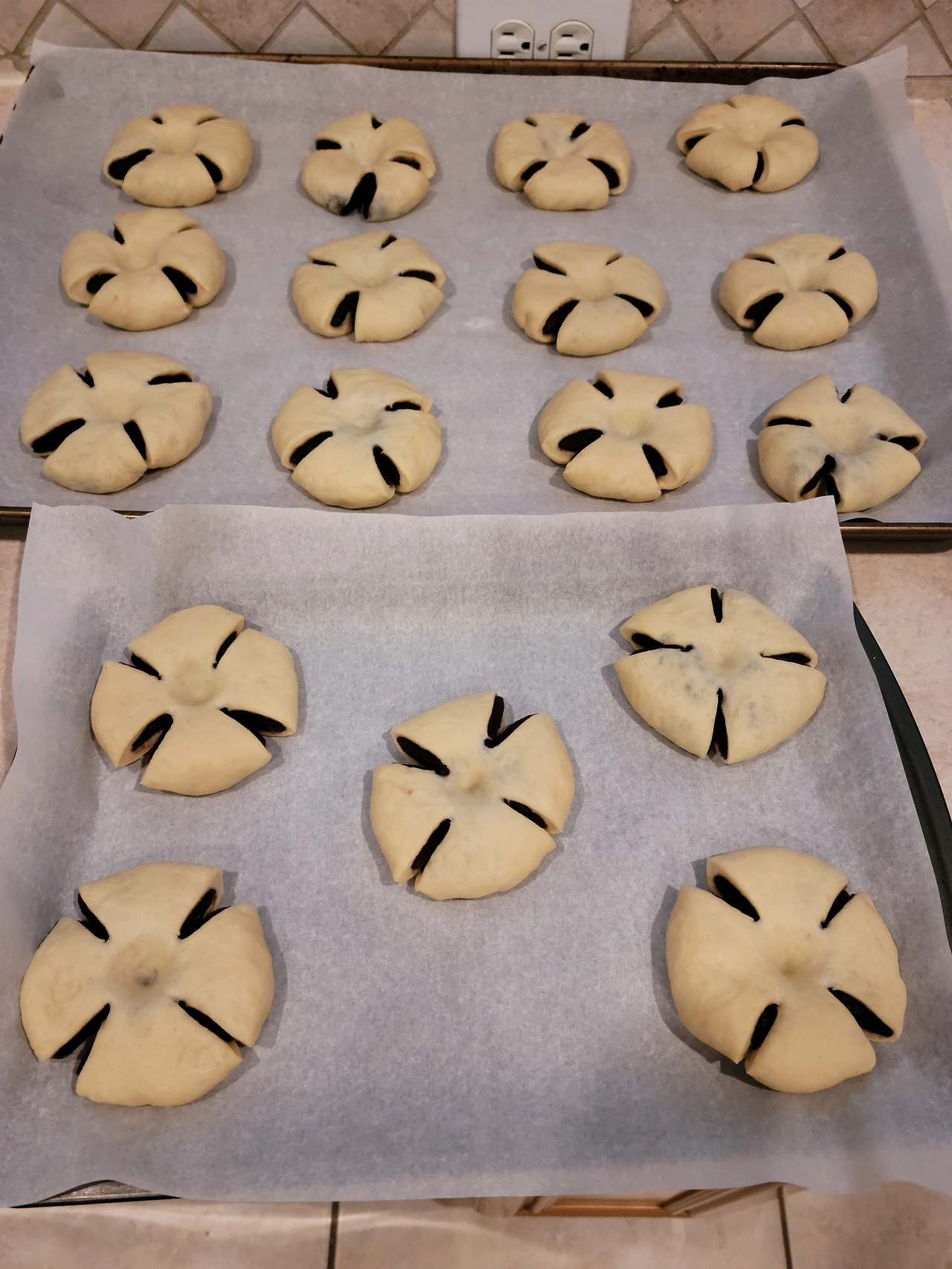 반죽 성형 다 마치면, 계란물이나 우유를 브러시로 살살 발라주고 굽는 거지.