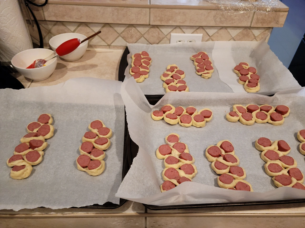 반죽으로 소시지를 감싼 후에 가위로 똑똑 잘라주면 돼. 근데 반죽 끝까지 자르면 안 된다!