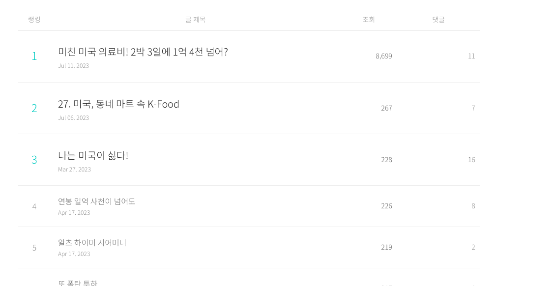 2박 3일에 1억 4천 의료비가 충격적이긴 한가보다. 통계를 보니 Top 3안 키워드가 모두 "미국"이 들어가는 것도 신기하다.