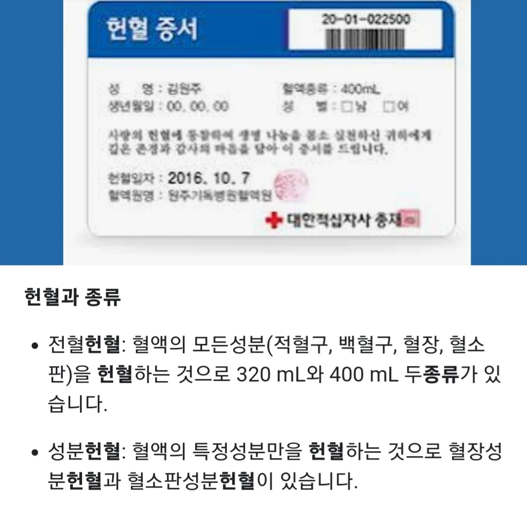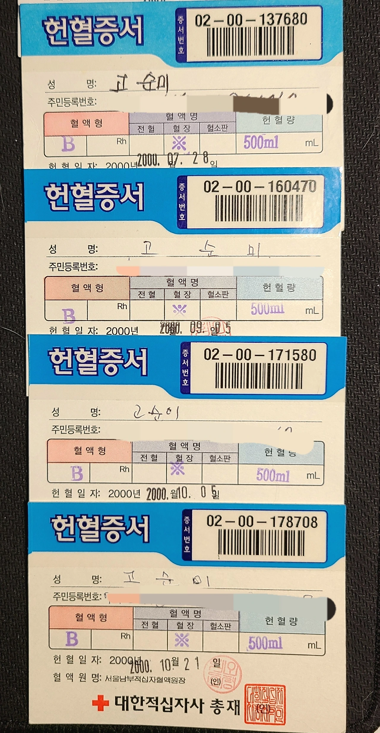 혈압이 낮은 편이라 한국에 있을 때, 헌혈하러 가면, 세 번 중 두 번은 못하고 돌아왔다. 그러나, 수혈할 때 도움을 받을 수도 있고 수혈이 필요한 사람이 유용하게 쓸 수 있대서 꽤 많은 헌혈 증서를 모았다.