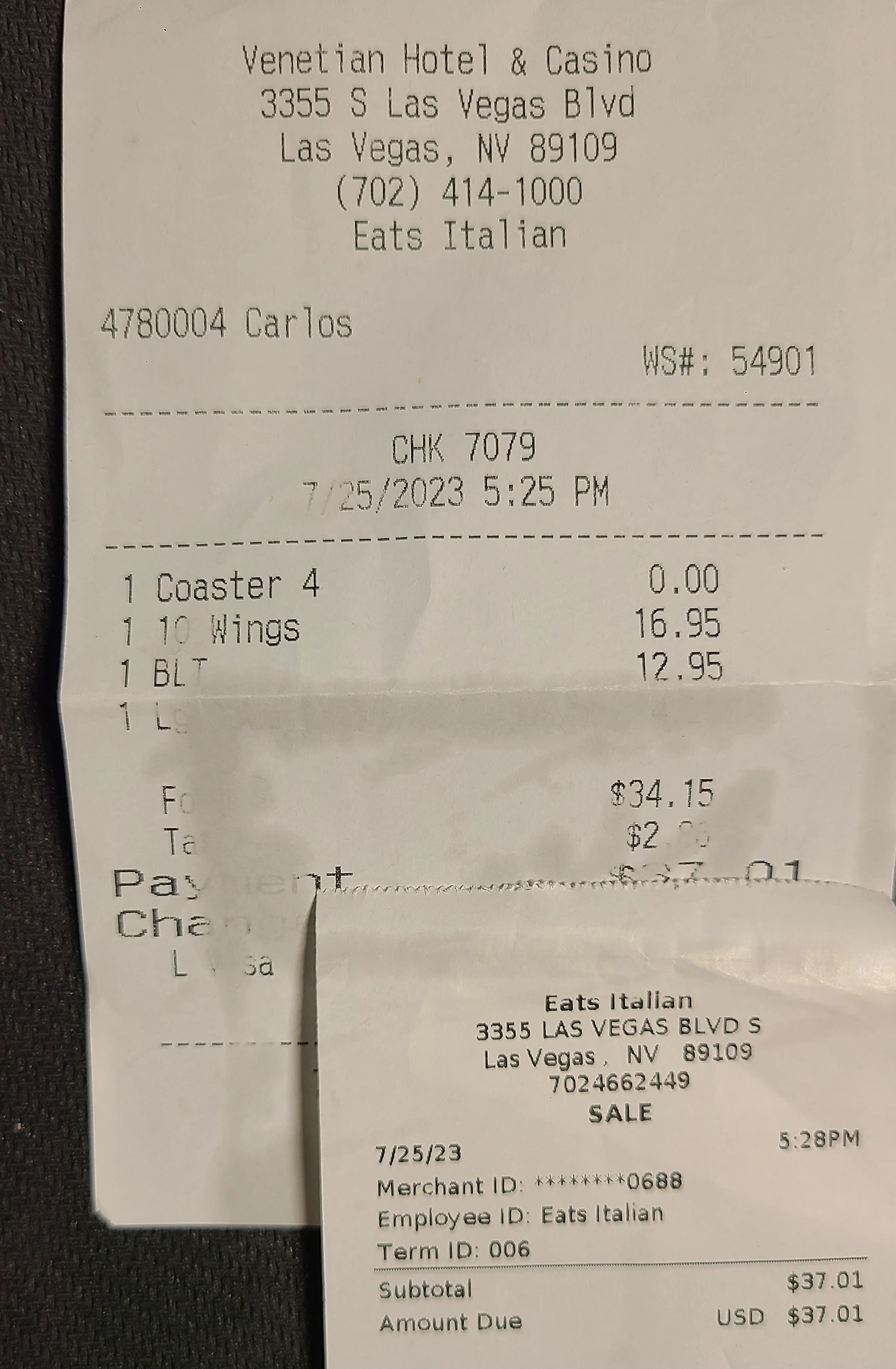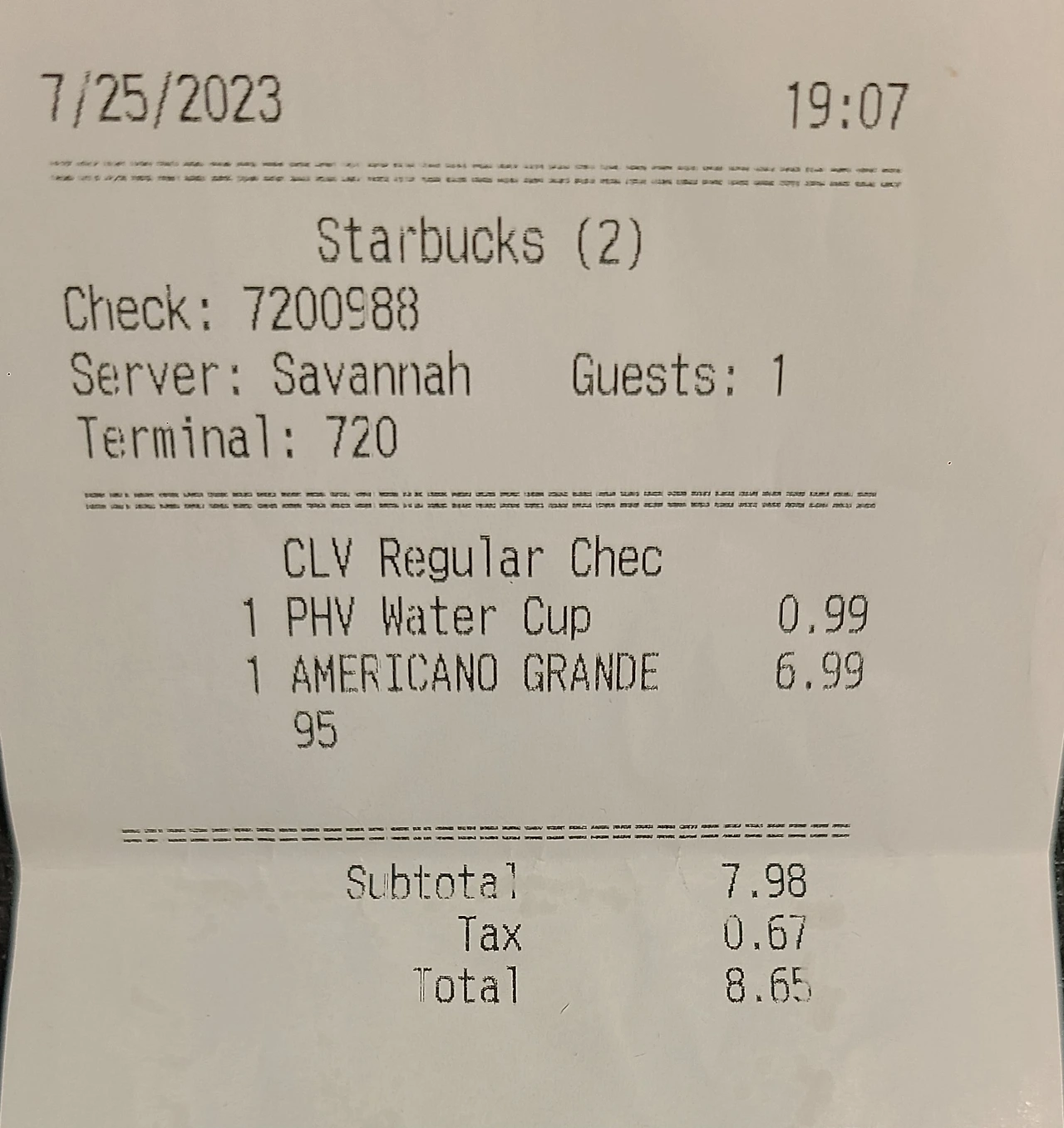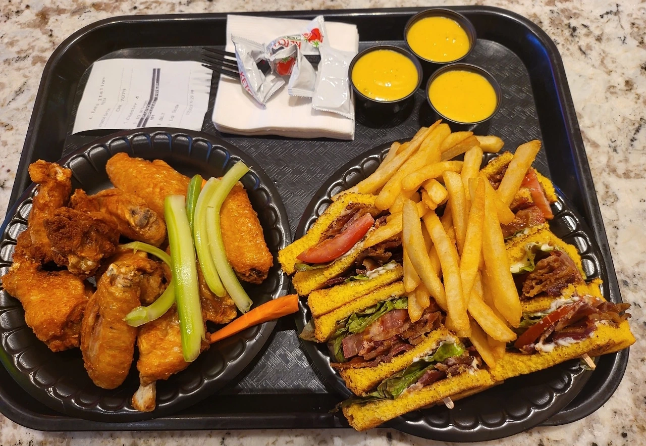 윙, BLT 샌드위치, 콜라 하나 시켰다. 영수증 일부가 지워져 안 보이지만 리필 안 되는 콜라 한잔 4.25불 총 37.01불 기준환율인 1,279.50을 곱하니까 47,354원. 말만 그란데인 톨 사이즈 정도 스벅 커피가 6.99 탭워러와 얼음 넣어 0.99 (리필불가) 세금 포함 8.65불 커피까지 총 45.66불 한화로 58,422원을 지불했다.