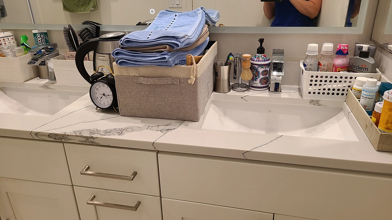 안방 욕실 크기가 예전 집의 절반도 안된다. 샤워 부스 하나 딸랑, 욕조는 없다. 변기를 놓는 공간도 분리되지 않아 여로모로 불편하다. 수납공간도 별로 없어 세면대 위에 터질 듯 올려진 물건 중 안 쓰는 건 비워냈다. 그런데도 살아남은 아이들이 한 바가지.