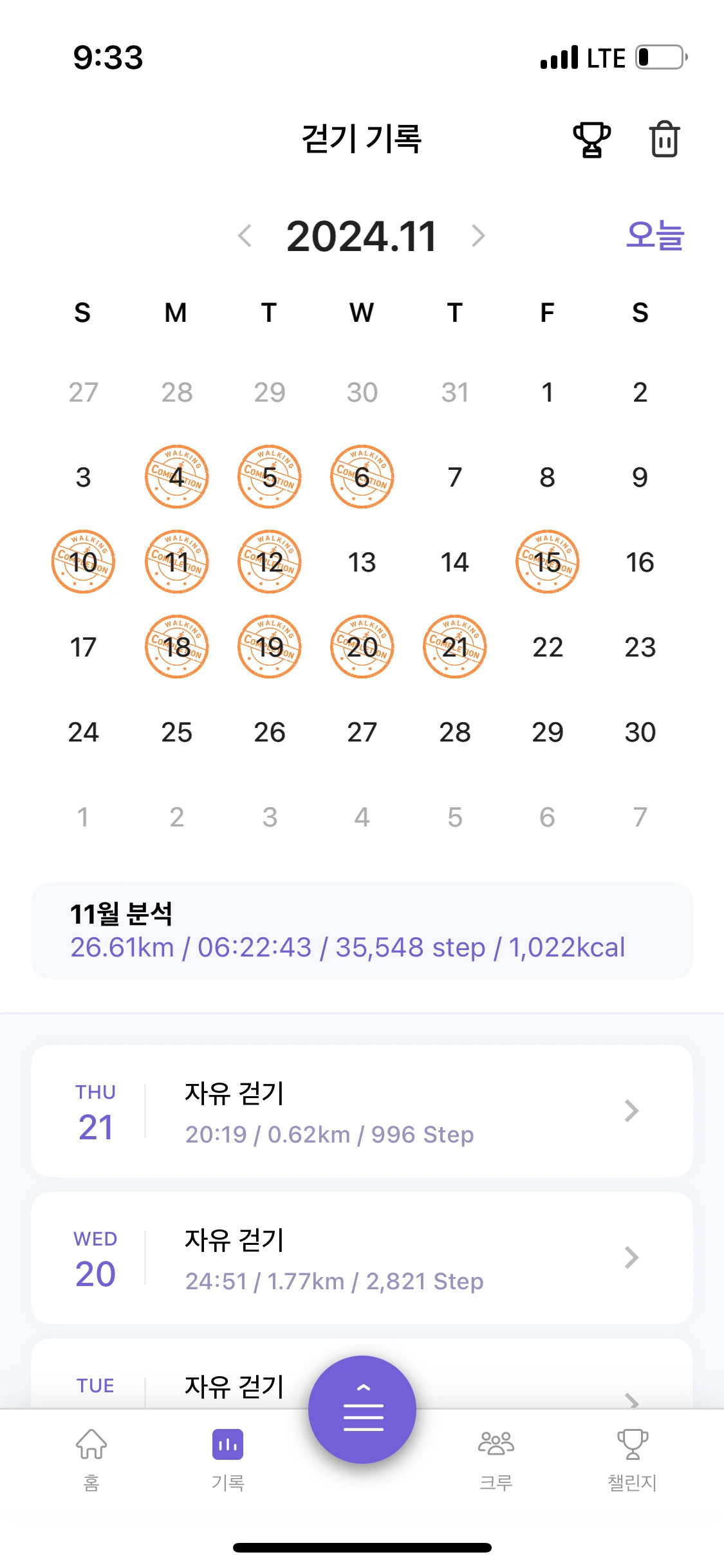 런데이는 처음에 바른 자세로 잘 걷고 싶어 시작한 것은 아니었습니다. 스탬프를 찍을 수 있으니까 기록도 되고 동기부여도 되라고 선택했어요.