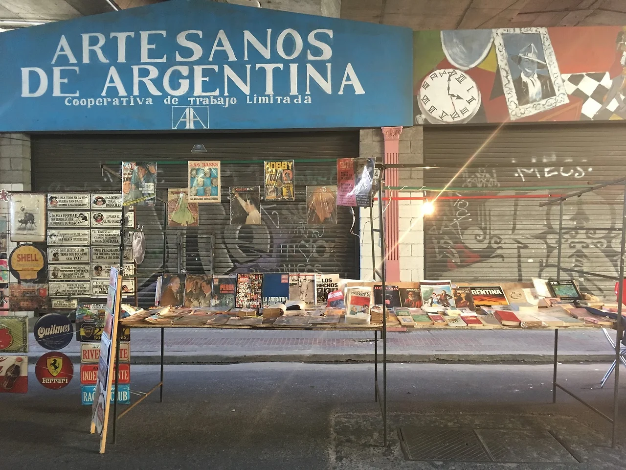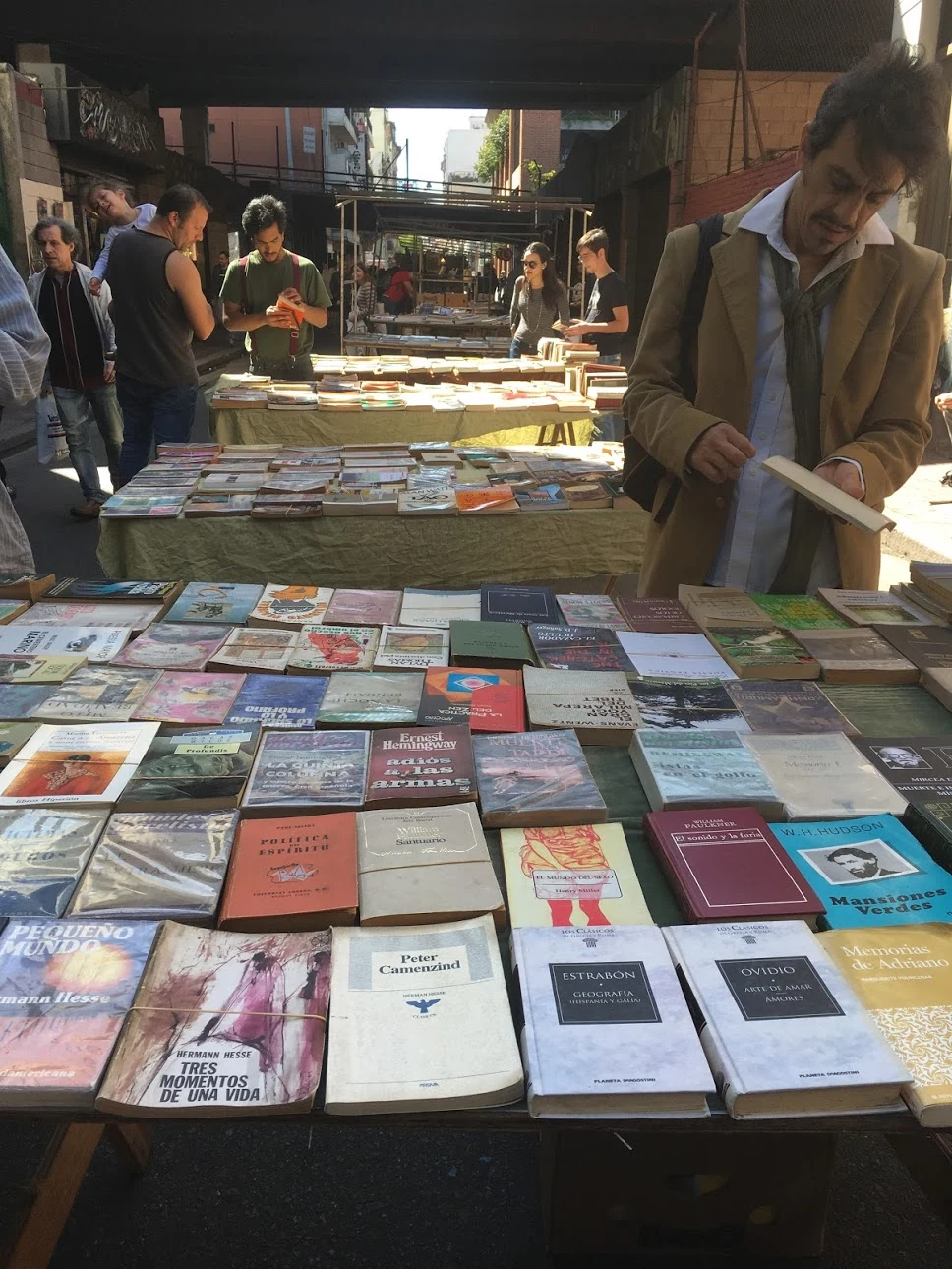 산텔모 동네와 책과 관련된 이야기를 하면, 한 가지 빠트리지 말아야 할 부분이 있다. 바로 매주 일요일만 나타나는 야외 서점에 대한 이야기다. 매주 일요일 9시가 되면, 산텔모 동네에는 규모가 큰 벼룩시장이 열린다. 그리고 이 시장 끝자락에 위치한 산 후안 대로 (Av. San Juan) 거리와 훔볼트 (Humbolt) 거리 사이에는 중고 서적을 파는 도서 판매대가 어김없이 등장한다. 책과 서점의 도시답게, 벼룩시장에서도 서점 판매대가 펼쳐지는 것이다. 이는 각종 골동품이나 초리소 같이 먹거리로 가득 찬 산텔모 거리에서 볼 수 있는 또 하나의 구경거리로써, 벼룩시장을 더욱 볼거리가 많은 장소로 만들어 준다.