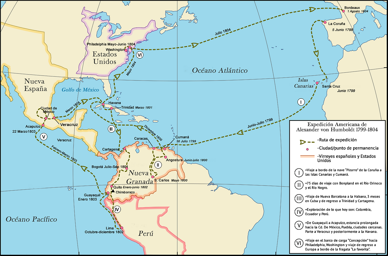 훔볼트는 여행 동안 카리브 해안뿐만 아니라 아마존 정글, 안데스 고원 지대를 지났습니다. 아마존 원주민으로부터 공격 받는 등 죽을 위기를 여러번 넘겼지만 그는 자신의 여정을 포기하지 않았습니다. 그는 5,700미터나 되는 침보라소 산을 오르고 총 6천개에 달하는 동식물 표본을 수집하면서 탐험을 통해 중남미 생태계와 관련된 방대한 기록을 남기게 됩니다.