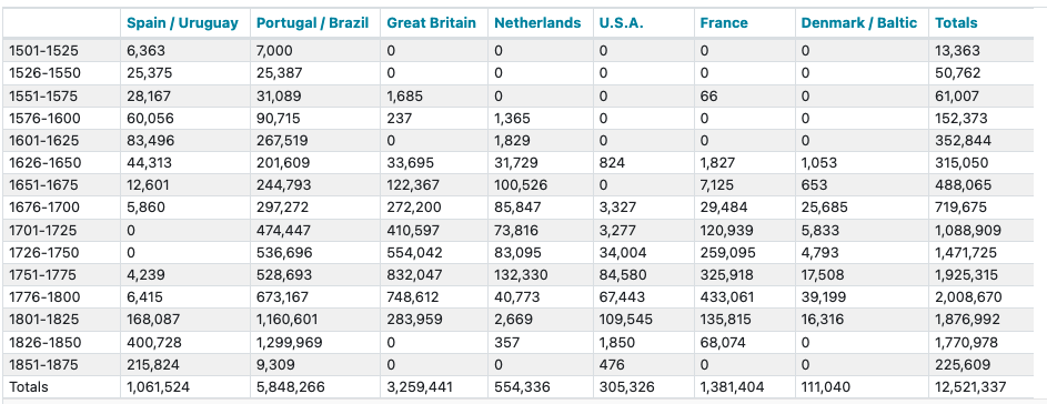위 표를 보면, 얼마나 많은 아프리카인들이 브라질로 왔는지 알 수 있습니다. 자료에 따르면, 대서양 노예무역 때문에 1,200만 명이 넘는 사람들이 자신의 고향을 떠났다고 합니다. 그중 6백만 명에 가까운 노예들이 브라질에 오게 됐는데, 이는 전체의 46.7%를 차지하는 수치였습니다. 또 1870년대 브라질 인구만 살펴보면, 전체 인구의 15%가 노예 신분이었습니다. 그만큼 노예 제도는 브라질이란 나라가 발전해오는 과정에 있어 중요한 부분을 차지했습니다.