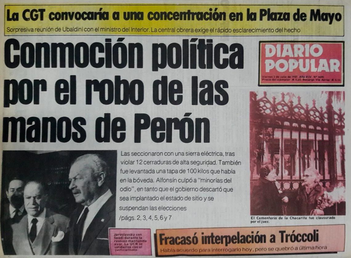 1987년 6월 29일, 아르헨티나에서는 믿기지 않는 뉴스가 헤드라인을 장식했습니다. 아르헨티나 정치 역사를 뒤바꾼 후안 페론 대통령의 무덤이 도굴꾼들에 의해 훼손됐다는 소식이 전해진 겁니다. 사람들이 더 충격을 받았던 건, 도굴꾼들이 관에 놓여있는 그의 손을 잘라서 가져갔단 사실이었습니다. 정체를 알 수 없는 도굴 단체는 후안 페론을 지지하는 정의당 (Partido Justicialista)에 편지를 보내 “페론의 손을 돌려받길 원하면 총 8백만 달러를 준비해라”라고 요구했고, 이를 거절하자 완전히 자취를 감춰버렸습니다.