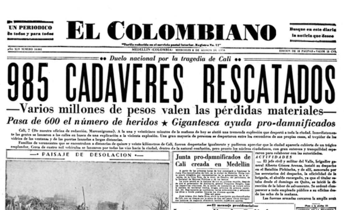 오늘의 주제는 콜롬비아 칼리에서 일어난 안타까운 폭발 사고 이야기입니다. 1956년 8월 7일 밤, 다이너마이트를 싣고 있던 군용 차량 일곱 대가 연쇄 폭발을 일으키며 엄청난 인명 피해를 일으킨 사건이었습니다. 사고 현장엔 반경 50미터, 깊이 25미터의 큰 구멍이 생겼고, 약 천 명의 사망자와 만 명이 넘는 부상자가 발생하게 됐습니다.