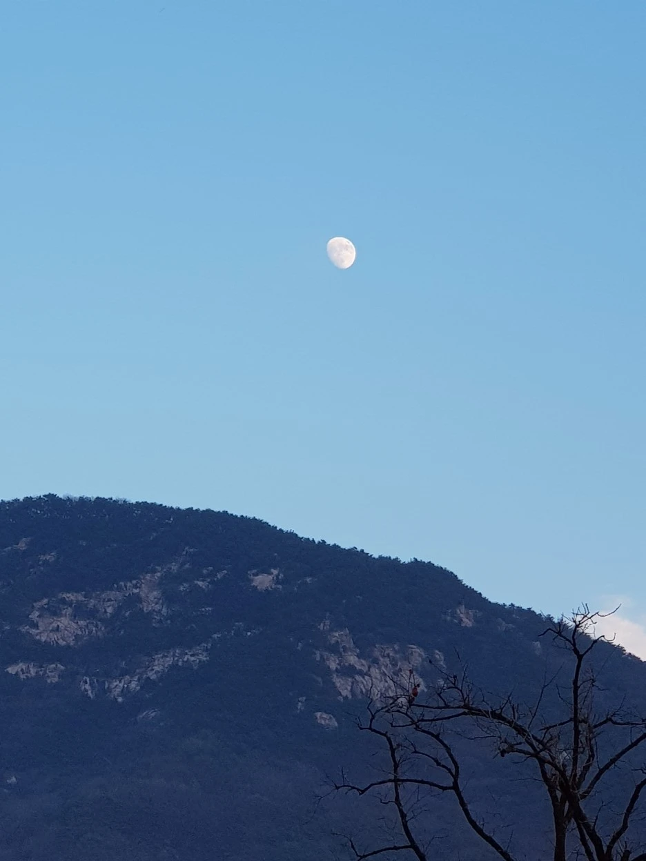 동지가 코앞이라 해가 짧다. 상주까지 남은 거리는 12km다. 이제 곧 깜깜해질 것이다. 사진 한 장을 찍고 서둘러 걷는다. 4시 40분. 하늘에는 달이 절반을 조금 더 채워 올랐다.