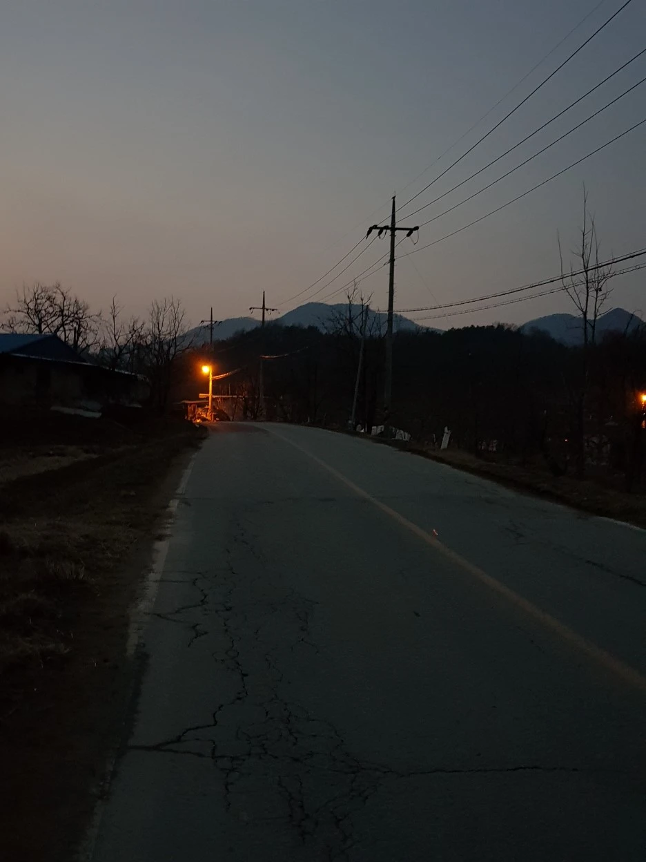 핸드폰 손전등을 켜고 걷는다. 어두운 시골길, 소똥 냄새, 개 짖는 소리, 이 길에 대한 기억은 그 세 가지다.
