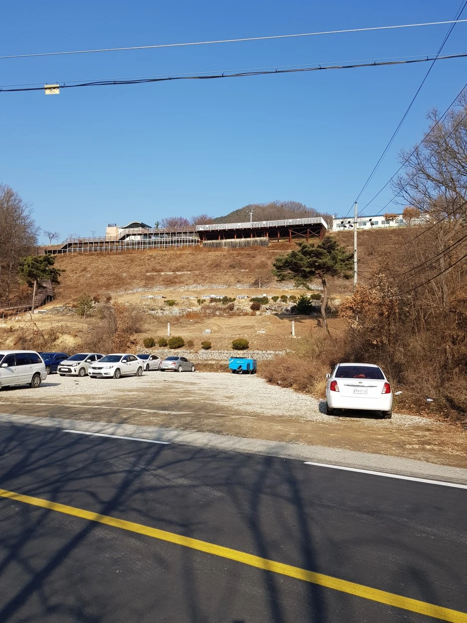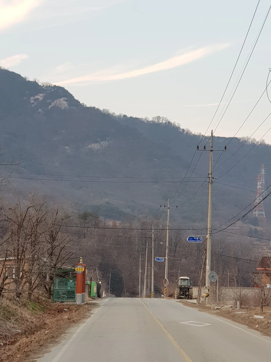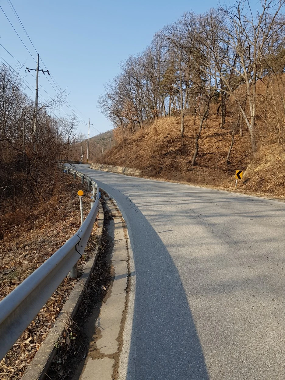 공장 진입로를 지나자 조용해졌다. 마침 고개 정상도 지척이다. 버스 정류장이 있어 어제 산 빵을 뜯어먹으면서 한숨 돌렸다. 언덕길만 40분가량을, 아무런 마음의 준비도 없이, 온갖 건설차량의 먼지를 뒤집어쓰고 올라온 터라 기진맥진이다.