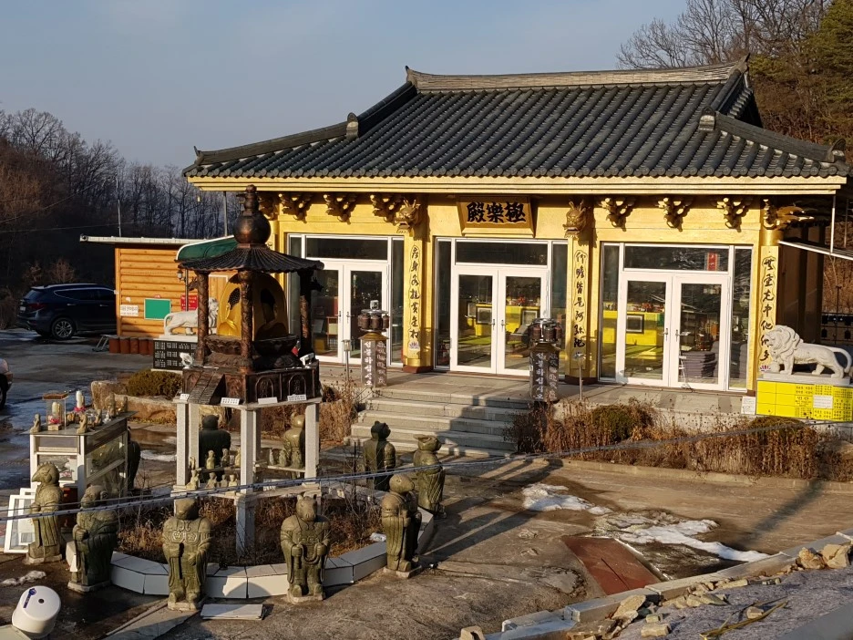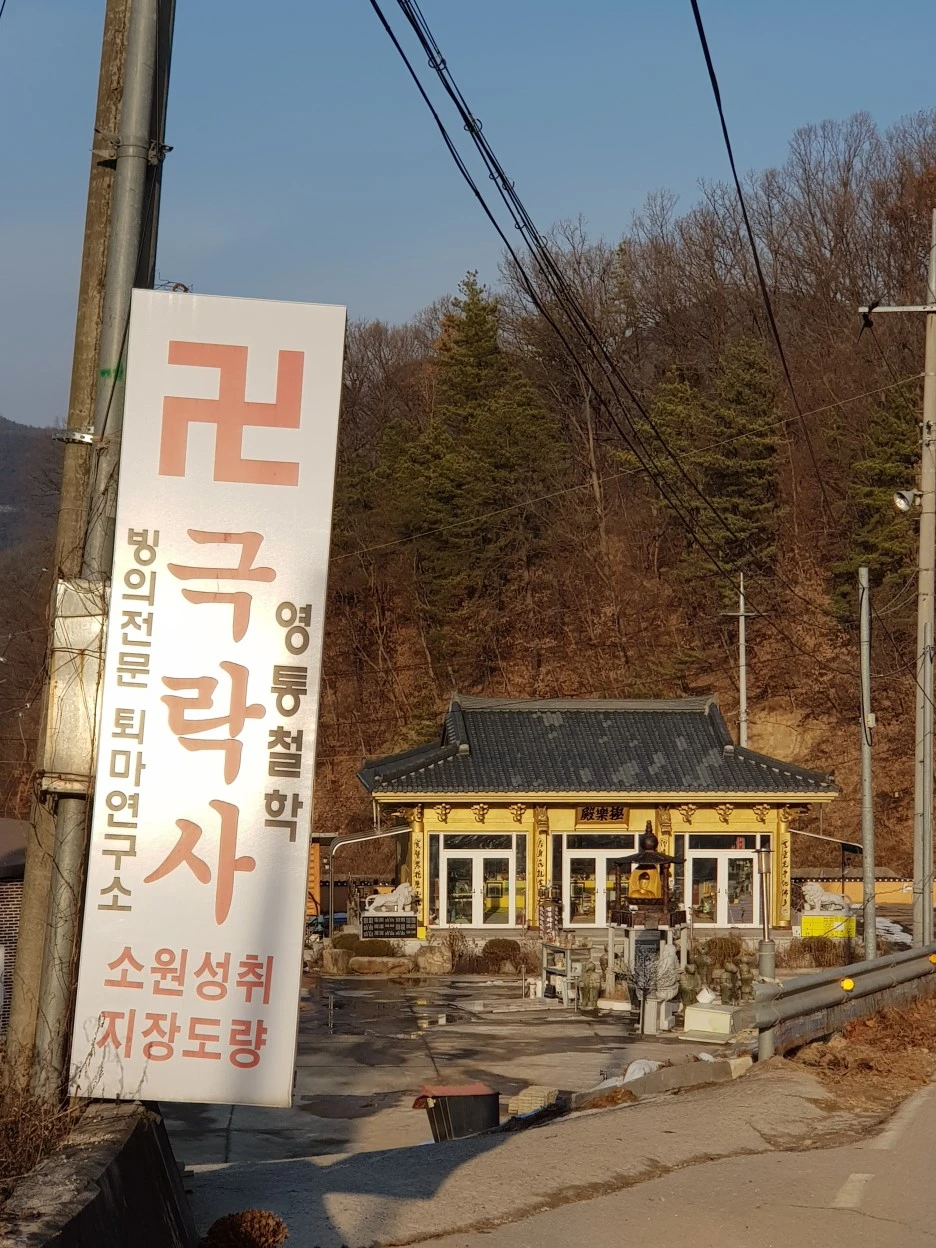 비교적 편안하게 내리막을 걷는다. 왼편으로 절이 보이는데, '빙의 전문 퇴마연구소'라니 흥미롭다.