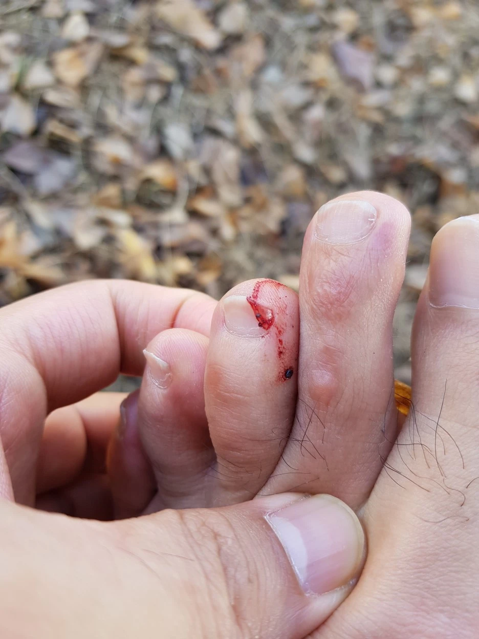 구멍가게에서 물 두 통을 사고 근처 정자에 앉아 발바닥에 붙여 둔 밴드가 제대로 있나 확인한다. 뜻밖에 발톱이 깨져 피가 나 있다. 이 정도면 느낌이 있었을 법도 한데 발바닥 통증이 워낙 심해 알아채지 못했다. 다행히 큰 상처는 아니다. 발가락을 밴드로 감으니 거뜬했다.