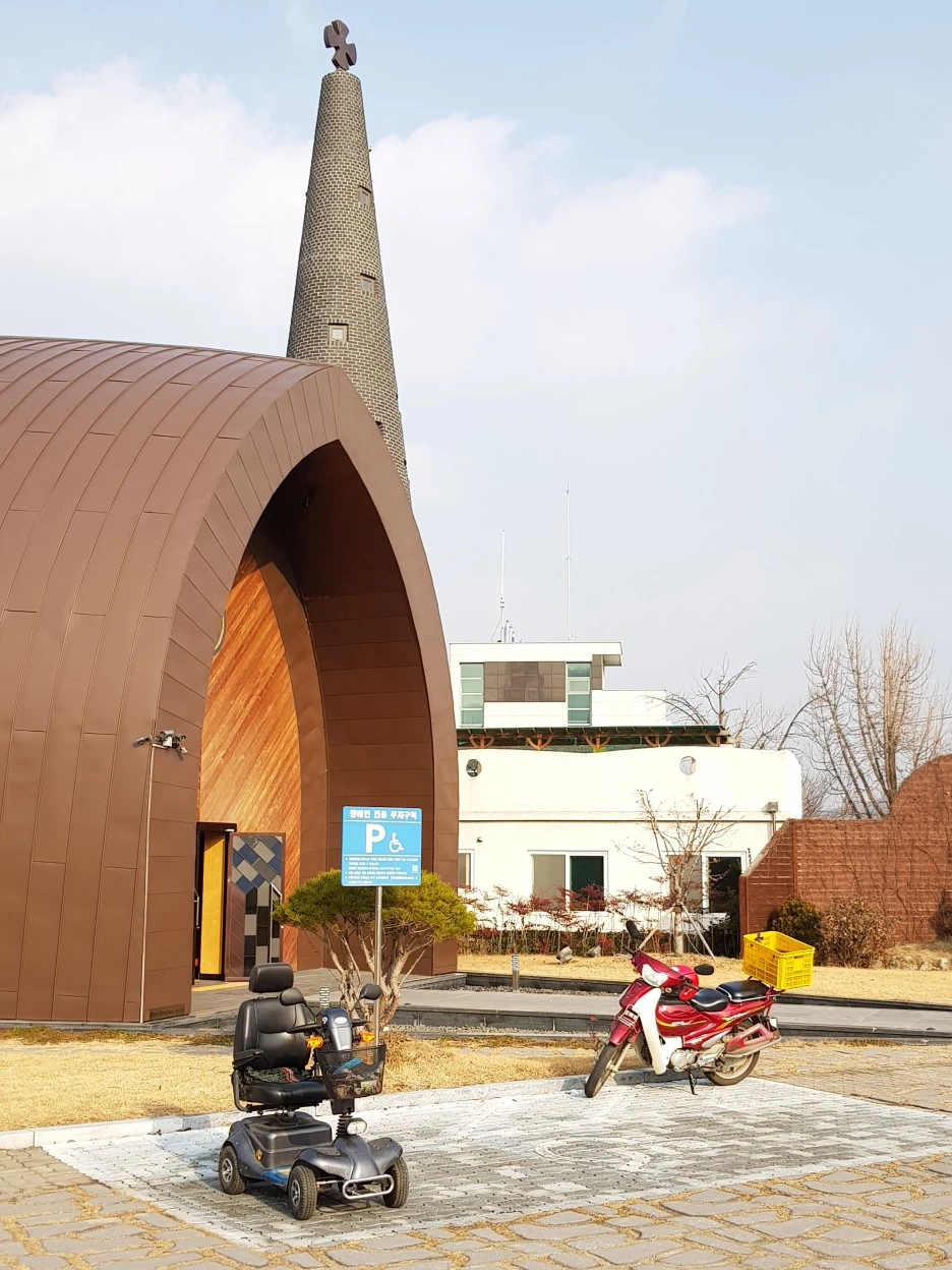 벤치에 앉아 발을 주무르며 보니 성당 앞에 전동 휠체어와 배달용 오토바이가 서 있다. 상징적인 장면이다. 예수님은 항상 병들고 가난한 자들과 함께 하신다고 했다.
