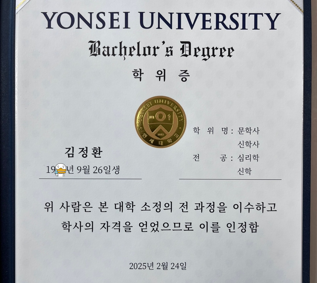 오늘 두 번째 학사 학위를 받았다. 정확히 말하면 두 번째와 세 번째다. 학위증에는 문학사(심리학)와 신학사(신학) 두 가지 전공이 나란히 적혀 있다. 이로써 나는 세 개의 학사(정치학사, 문학사, 신학사)와 한 개의 석사학위(정치학석사) 소지자가 되었다.