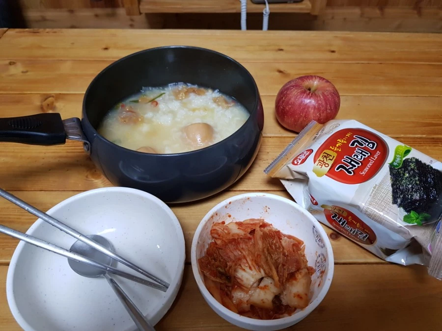 즉석북어국에 즉석밥과 삶은 달걀을 넣어 아침식사를 준비했다. 어제 산 사과가 후식으로 제격이다.