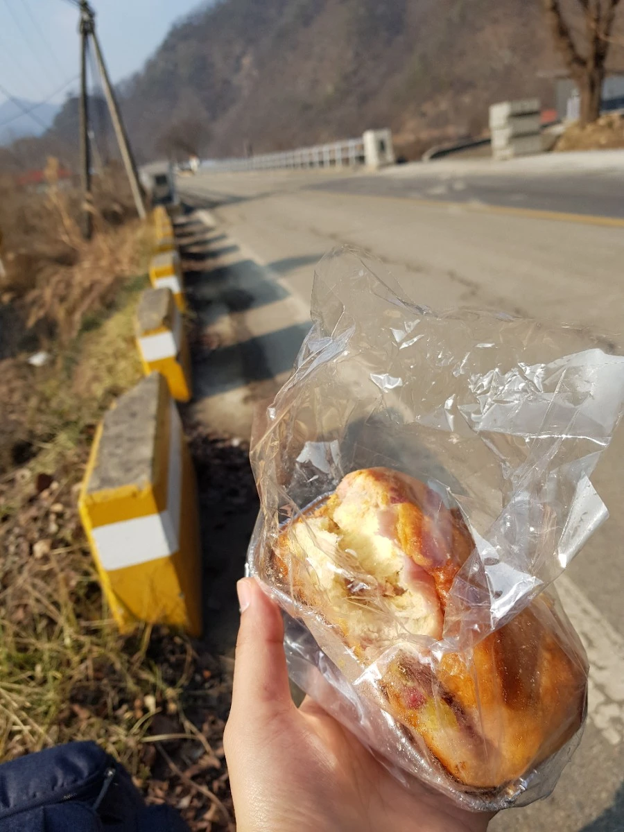 두 시가 넘었다. 붕어빵과 팥죽 덕에 배가 아주 고프지는 않다. 그래도 한숨 돌릴 겸 도로변에 앉아 빵을 꺼냈다. 점촌에서 샀던 고구마빵이다. 사과를 곁들이니 그런대로 든든하다.
