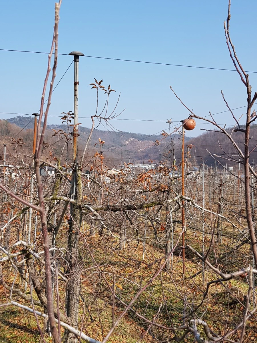 여기도 사과밭이다. 꼭대기에는 일부러 따지 않은 듯 묵은 사과가 매달려 있다. '까치밥'이다. 까치나 까마귀들에게 베푼 인간의 인심이라 할 것이다...