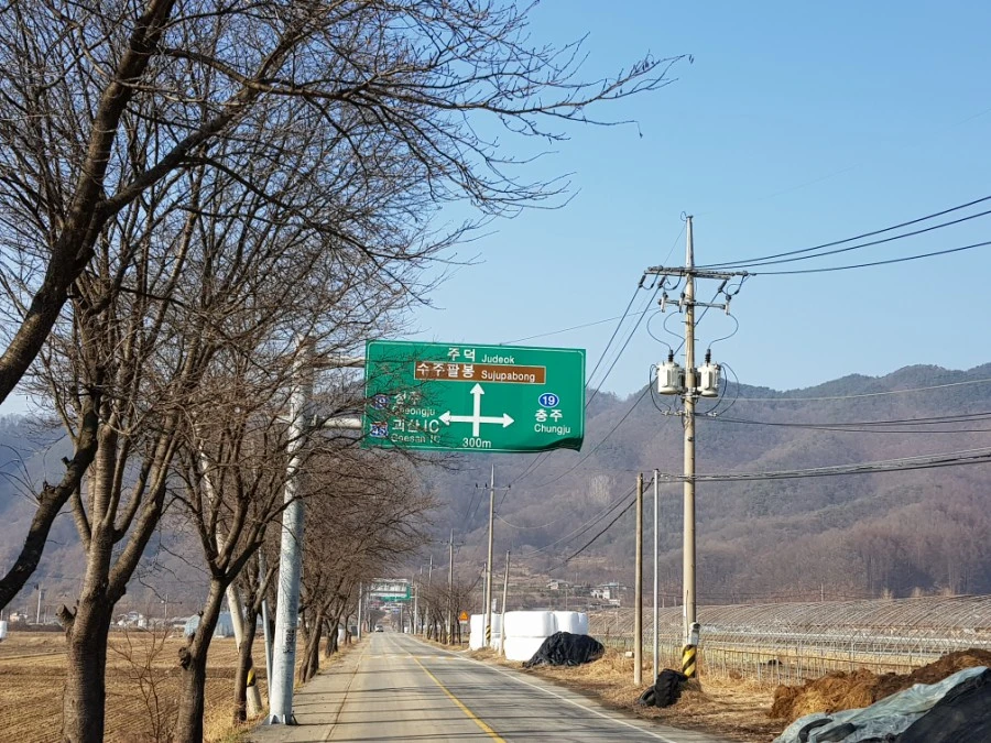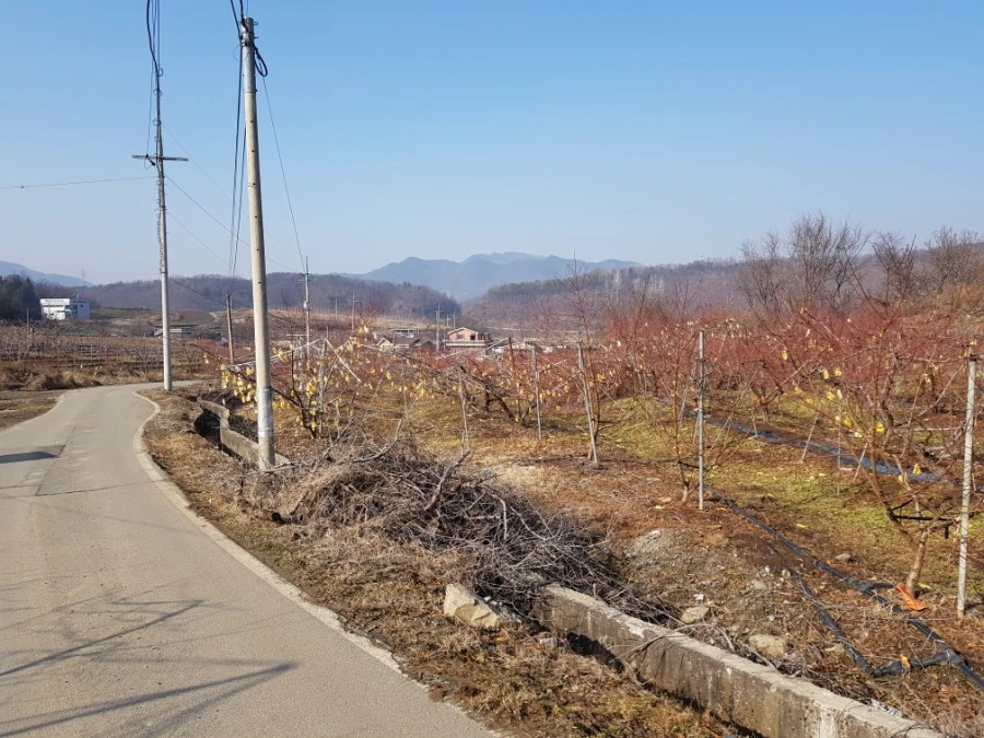 충주는 일조량이 풍부해 과일 재배에 유리하다. 남부지방에서 나던 복숭아도 최근에는 지구온난화의 영향으로 충주에서 많이 생산된다. 길 오른편으로는 복숭아, 왼편으로 사과밭이 이어진다.